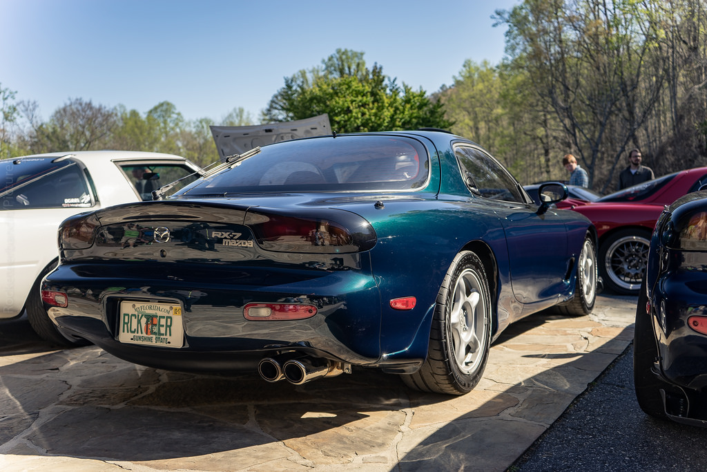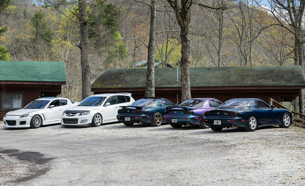 On Friday, the event holds a classic meet for all the rotaries to participate in Judging for best generation RX7s and receive an award that evening. So I got my car at the site rather early. I won't say how early but it was brisk at low 40s. Got there and saw that everyone had left their cars in the lot over night. There were two unofficial parking spaces left so I pulled backwards into one. I walked back to my cabin made coffee and got ready for the day. I let Jeanne sit back on this event so she isn't overloaded with cars this cars that blah rotary brap brap. When I walked back to the main lot, everyone was already out cleaning their cars with detailer and rags of micro fiber clothe. So I began my quick clean up of the engine bay and wiped all the pollen that the Appalachian had given to me. I detailed the outside just in time and the meet was underway.