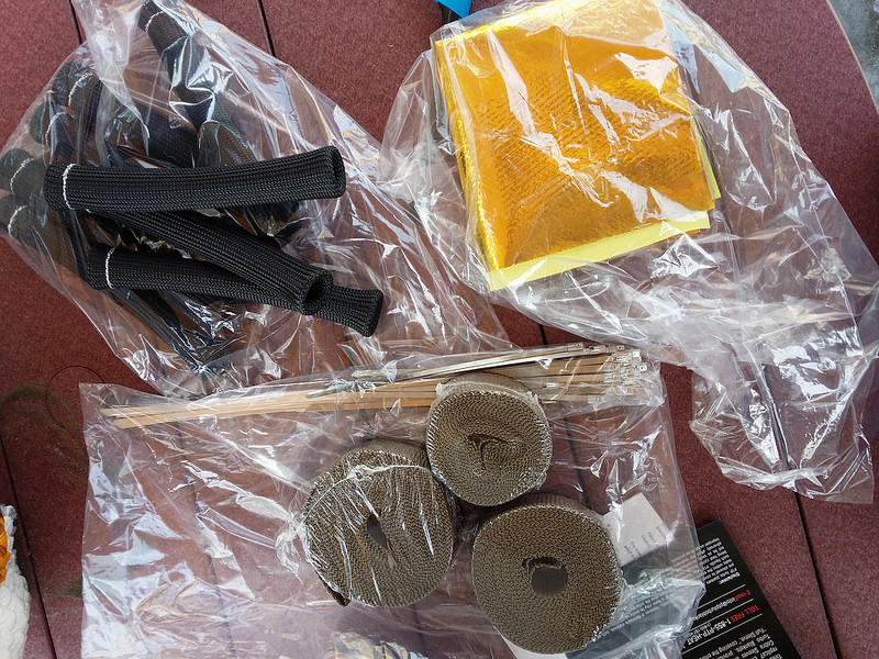 Spark plug boot covers, heat wrap for all the radiator hoses with heat resistant zip ties, Gold adhesive wrap for the transmission tunnel to reduce cabin temps and firewall drivers side, and heat wrap in 1" diameter for hoses and 2" X 50ft for downpipe and exhaust.