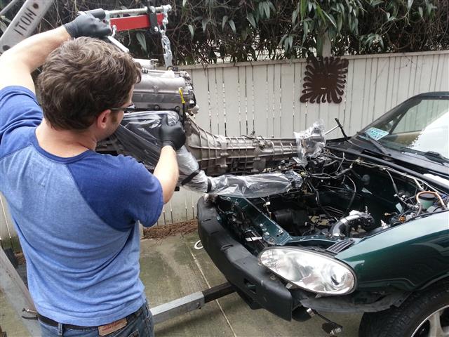 Curly came over, wrenches flew. Clutch / trans were installed and then we put the header on. Began easing it into the car.