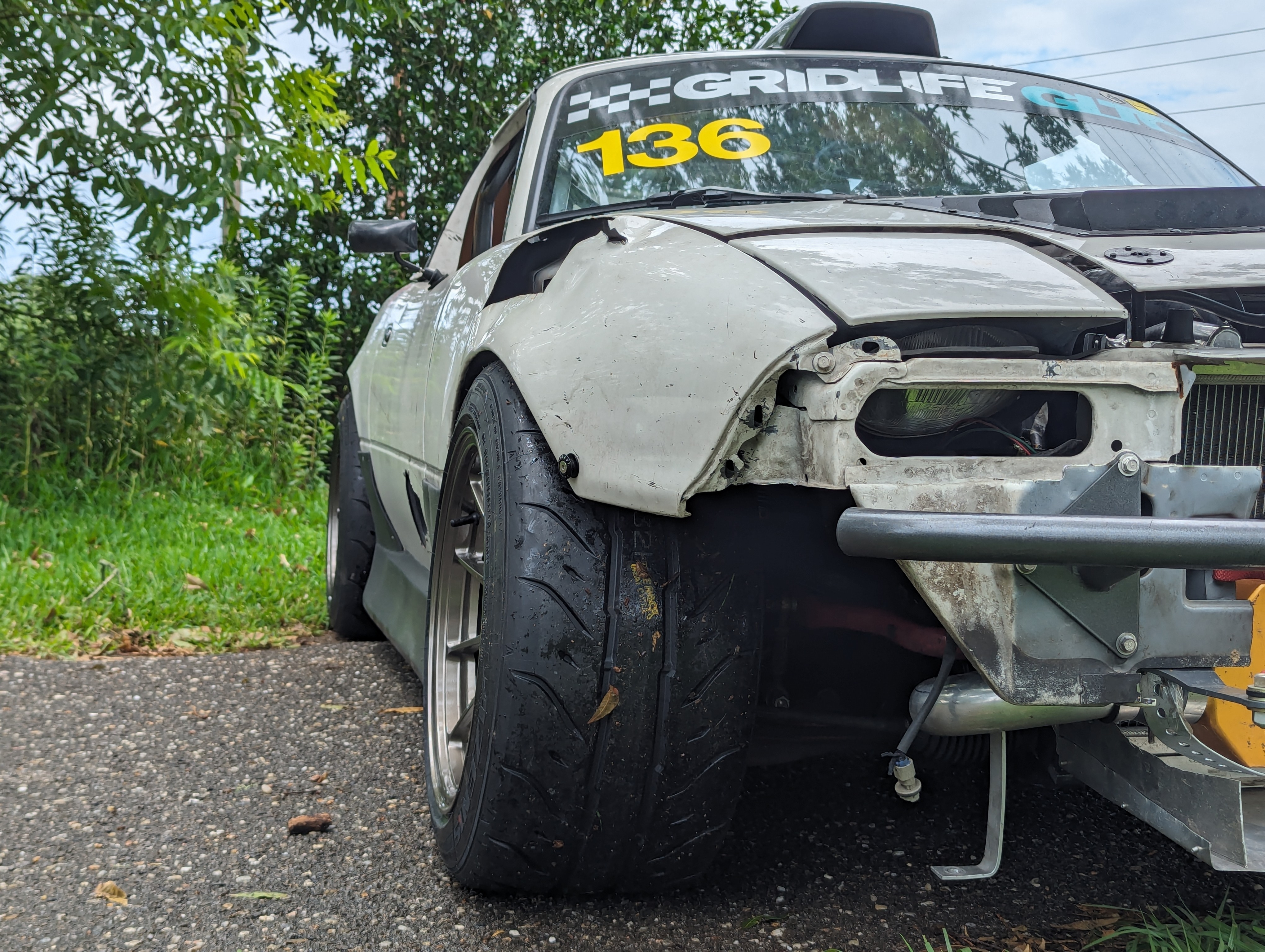 Had the amazon fender roller I've had for a while out for all of 15 minutes before saying eff this and brekaing out the mini sledge, 245s on 10s are a go. Paint is not very happy on rear fender, but with no springs/bumpstops only baaaarely have some interference at full compression, tire can still move, but is rubbing top of tub (there's a rub mark so even 225s must have been doing that. Fronts gonna need more work to actually turn at full compression, but haven't decided what direction I'm going with that between just beat the hell out of the rear section or do typical cut outs. While in there with no springs and test fitting found that my bumpstops were very brittle and ready to fall apart, so have ordered new ones from Supermiata. Also resprung to 1100/600 (again) as that's been the best baseline thusfar and no additional Gs or compliance have shown up trying to run softer springs. Only thing is I'm running the softer of the two RB tubular bars so I think I'm technically set up slightly loose in comparison to running Race bar up front. Will continue to evaluate. If anything I'll likely drop to a OEM 12 or 11mm rear bar vs beef up the front if I need to move FRC forward.