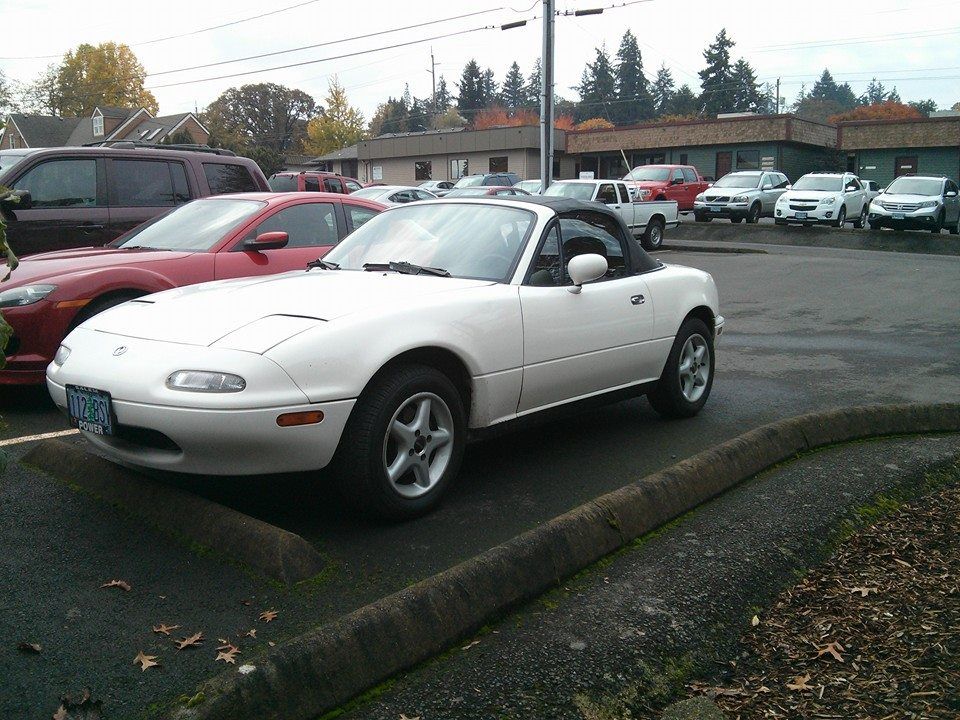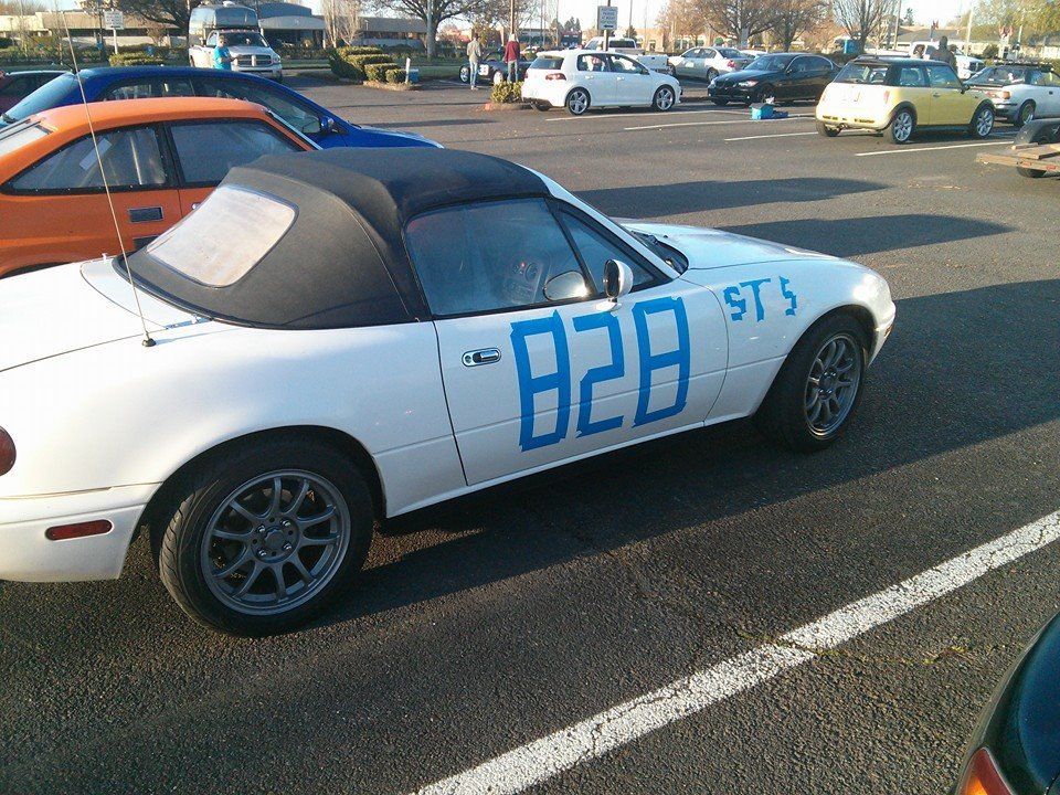 Save for the wheels, it was 100% stock. Including the 140k mile suspension and super-ratty top. Clearly those needed to be fixed, so a new top and FM Tokico 2.5 package were the first things on the list. Purchased and installed in December 2014. Also got some wheels and tires off a local Miata owner upgrading to 6ULs. Pic from my first autocross: