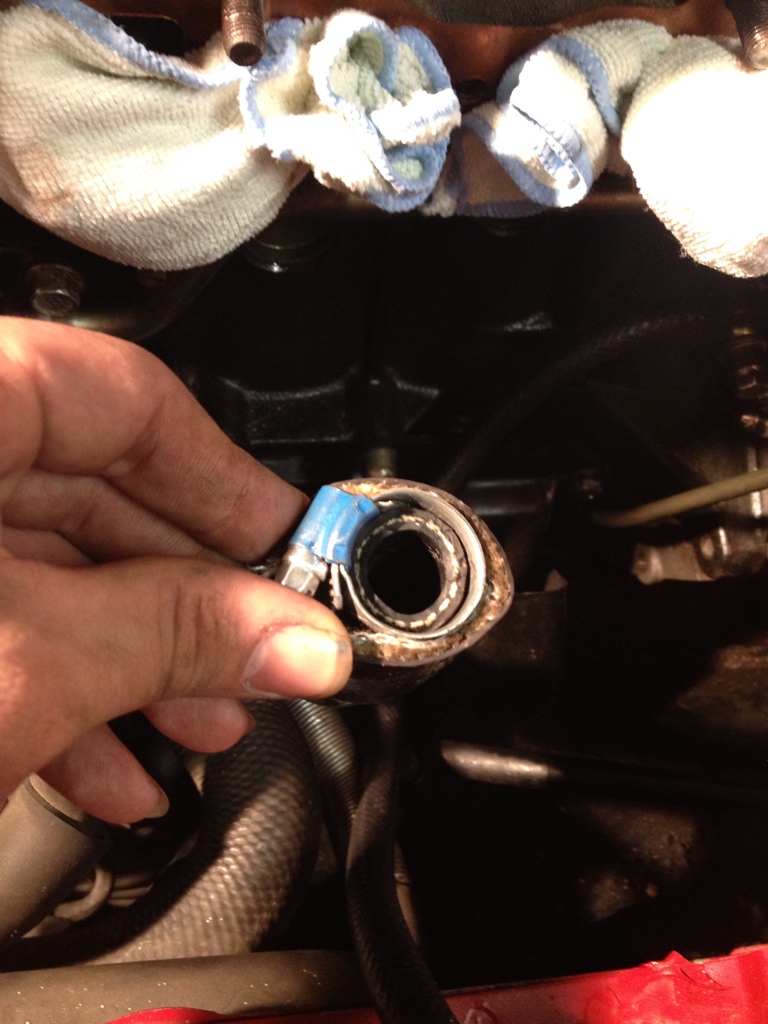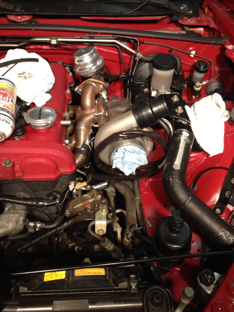 progress. one step forward, one step back. got the turbo mounted in place with all the plumbing done. unfortunately that wasnt done two days ago because when we started to put everything in place, my buddy decided to tighted the oil feed fitting hulk tight and broke off the bangjo bolt in the block...................