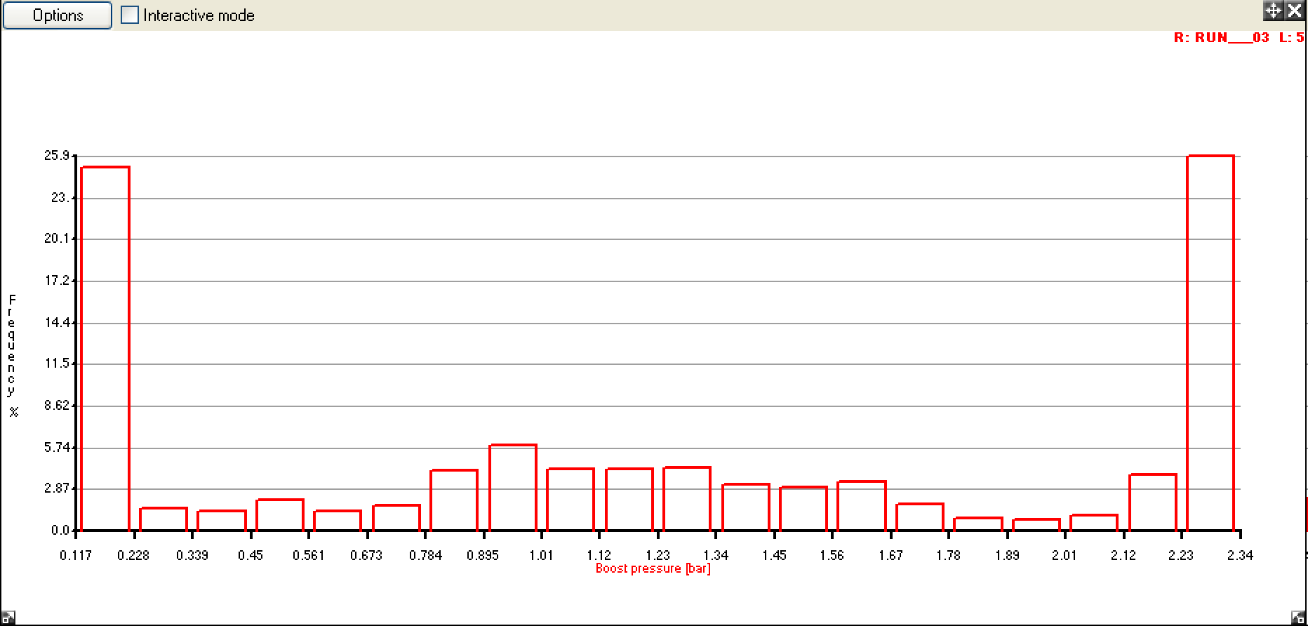 Buckets by boost aren't all that different, 80% of the WOT time is at 2.3 bars, and most of what's left is in the next-to-the-top bucket. On a track like Laguna, with a gearbox as close as a Miata 6-speed, there isn't much chance for RPMs to fall below the boost threshold, and a modern BB turbo like my GTX2863 doesn't lose much speed on shifts.