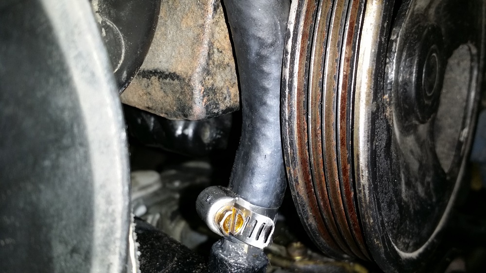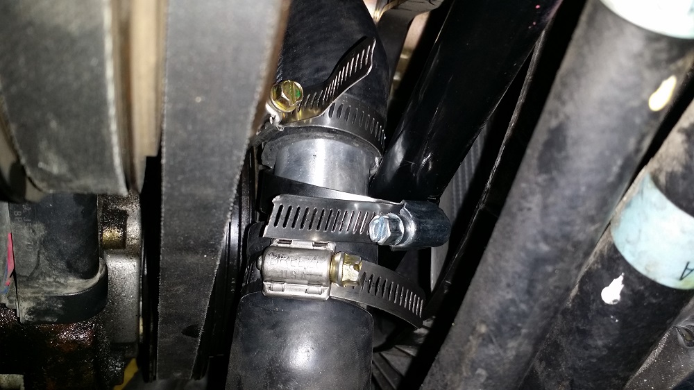 Here is where I hose clamped the lower radiator hose to the swaybar to keep it away from the pulleys and belts.