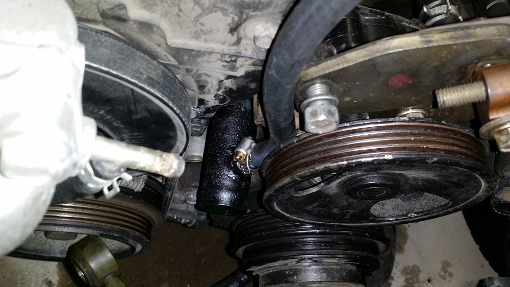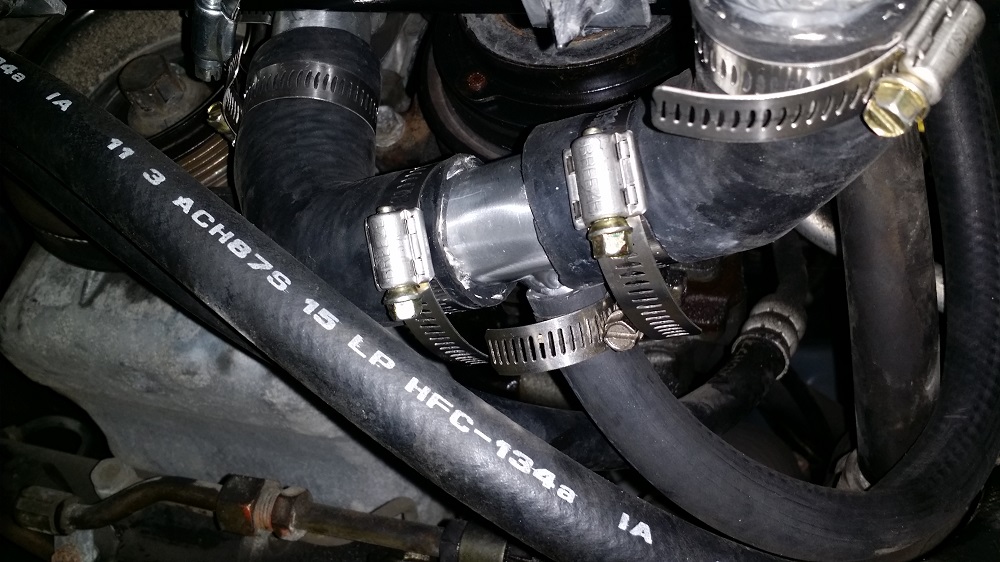 Here is where the re-routed heater core line goes into the new lower radiator hose.