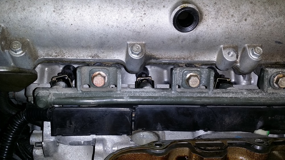 Here is a tip for anyone doing injectors. The first time you do injectors take some RTV and stick the spacers in their correct locations. This makes it easier to get the fuel rail back in place, and the next time you pull the fuel rail there is no chance of a spacer dropping down into the depths of the engine never to be seen again.