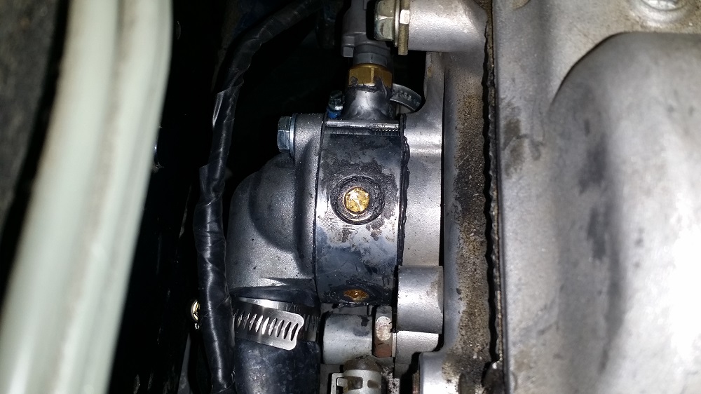 Here is the rear thermostat housing... got RTV everywhere putting that ************ in place.