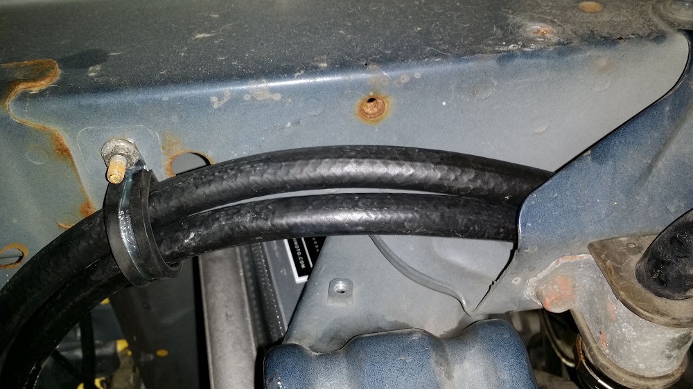 And here in my opinion is the proper routing of the power steering lines for the BEGi power steering cooler. The stud that the rubberized clamp is mounted too is one of the mounting points for the fog lights, and the lines are running in the gap between the frame rail and the mounting point for the front sway bar.