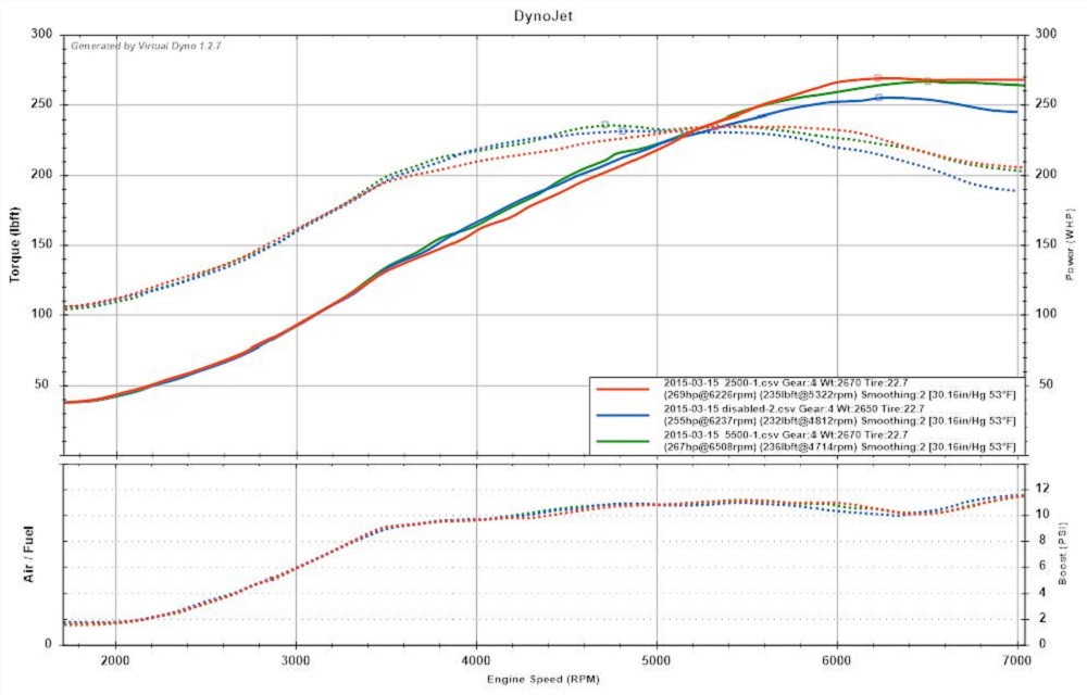 Red is active VICS from 2500 to Redline, Blue is VICS disabled, and green is VICS crossover at 5,500 RPM.