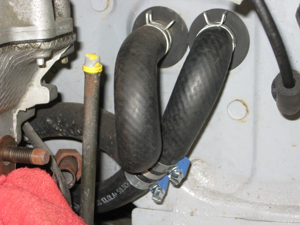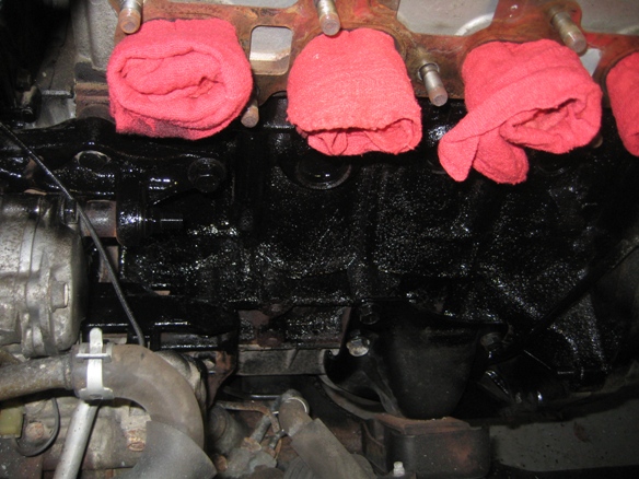 You can see in the pictures I tried to use that paint over rust stuff on the engine, not the best job in the world, with the little lighting I had. I also took a couple of pictures of the sump connection, the oil supply line and the intercooler, which is temporarily held in with the old bolts from the tow hooks. The EGR tube is removed and a metal piece is used to close the hole (last picture). I mocked up the lower radiator hose re-route for now, waiting on those parts too!