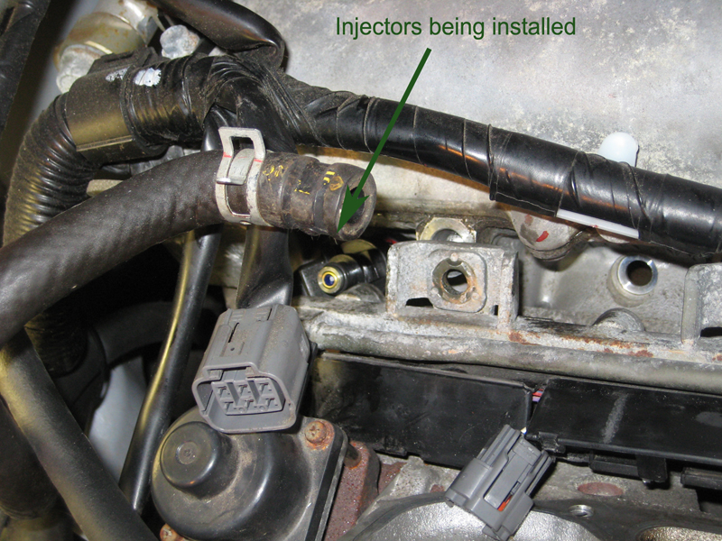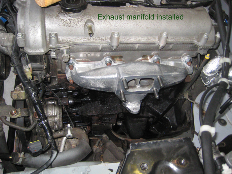 Anyway, I installed the injectors a few days ago, put back the intake today, and installed the exhaust manifold and loosely connected the turbo. The manifold holes of course did not line up, so I had to widen on the of the holes slightly. I had problems with the turbo placement because the turbo would not go on without taking the studs on the exhaust manifold off first and leaving only one of the lower ones. Then I found that the turbo hit the shelf next to it, so I trimmed the shelf with a Dremel.