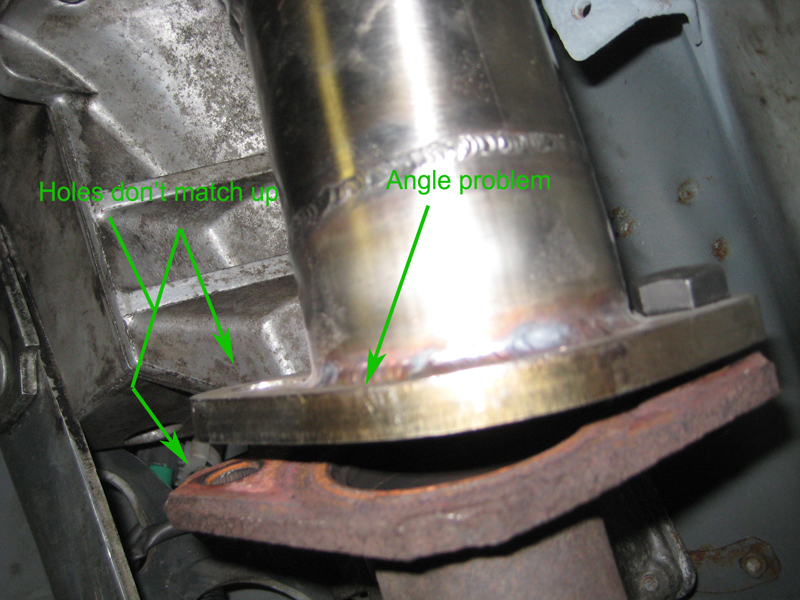 The angle between the downpipe and the cat was off, the flange holes did not line up with the studs, and the holes in the down pipe flange were too small for the studs. I took out the studs from the Cat, tried different fasteners, just in case they were bent, but the discrepancy is so large, it is definitely not from the Cat. I sent an email to Stephanie, hopefully she can get this stuff resolved... I cannot believe this project is taking so long, let alone the amount of time it took to get the stuff in and now, it does not even fit