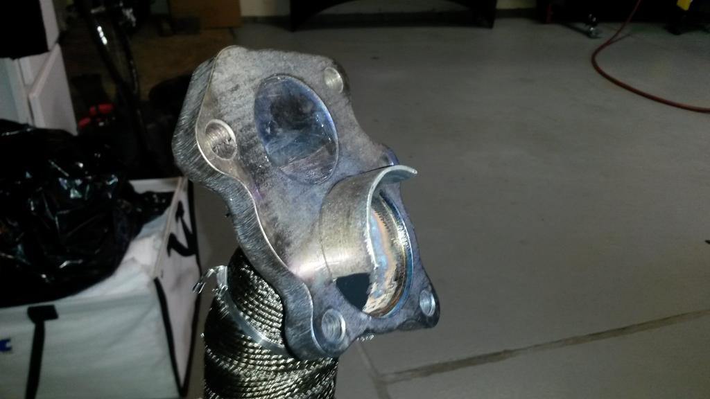 I made the downpipe this weekend out of 409 stainless, well...tack welded it and HHammerly tig welded it (thanks!), total cost was $50 (2 180degree dynomax bends from Summit) plus the Vibrant flange $30. One of the holes in the flange was a little off so it had to be enlarged. Thankfully Hhammerly as a lathe that took care of it.
