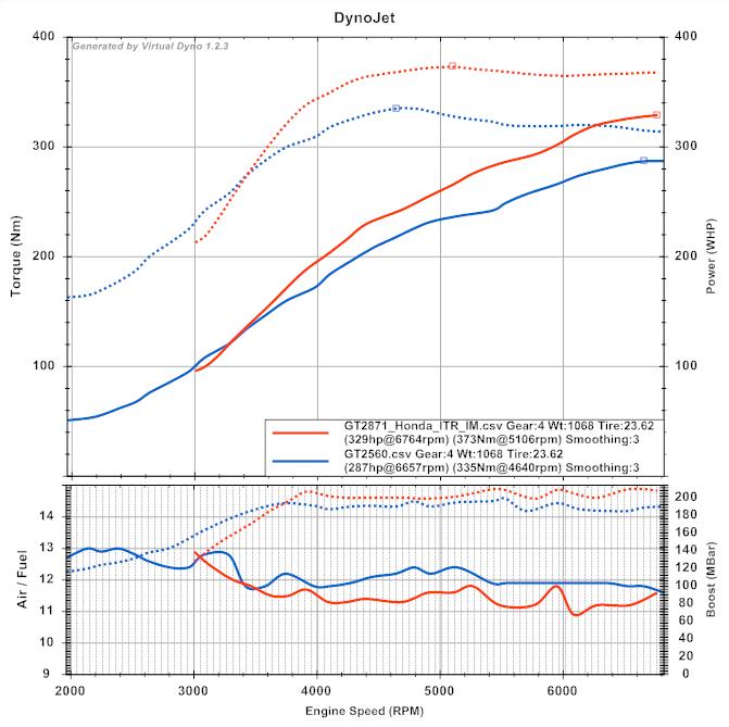 Although VirtualDyno isn’t a real dyno it is still a good result, 330whp with only 15psi. Seems that the Honda IM is flowing well