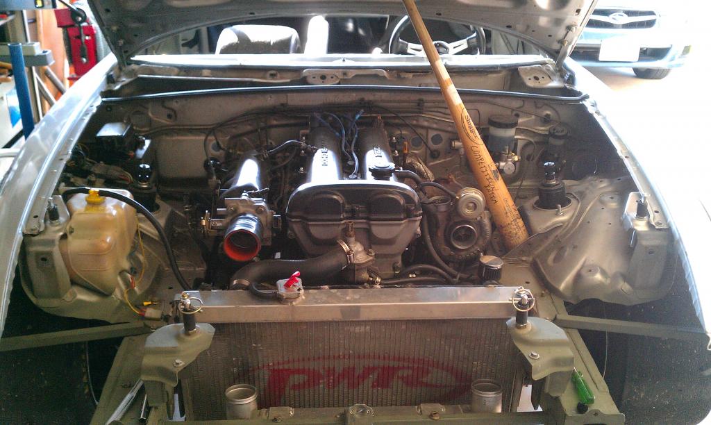 Here was the engine bay last November when I decided to listen to a certain FPrepared Datsun driver about engine rebuilds. "If I don't rebuild/refresh the motor at 8 years, it blows up at 10." I built the motor as a fun street motor with a turbo ~7 years prior. Note: the FP Datun's motor blew up as I crossed the finish line at my first trip to Nationals.