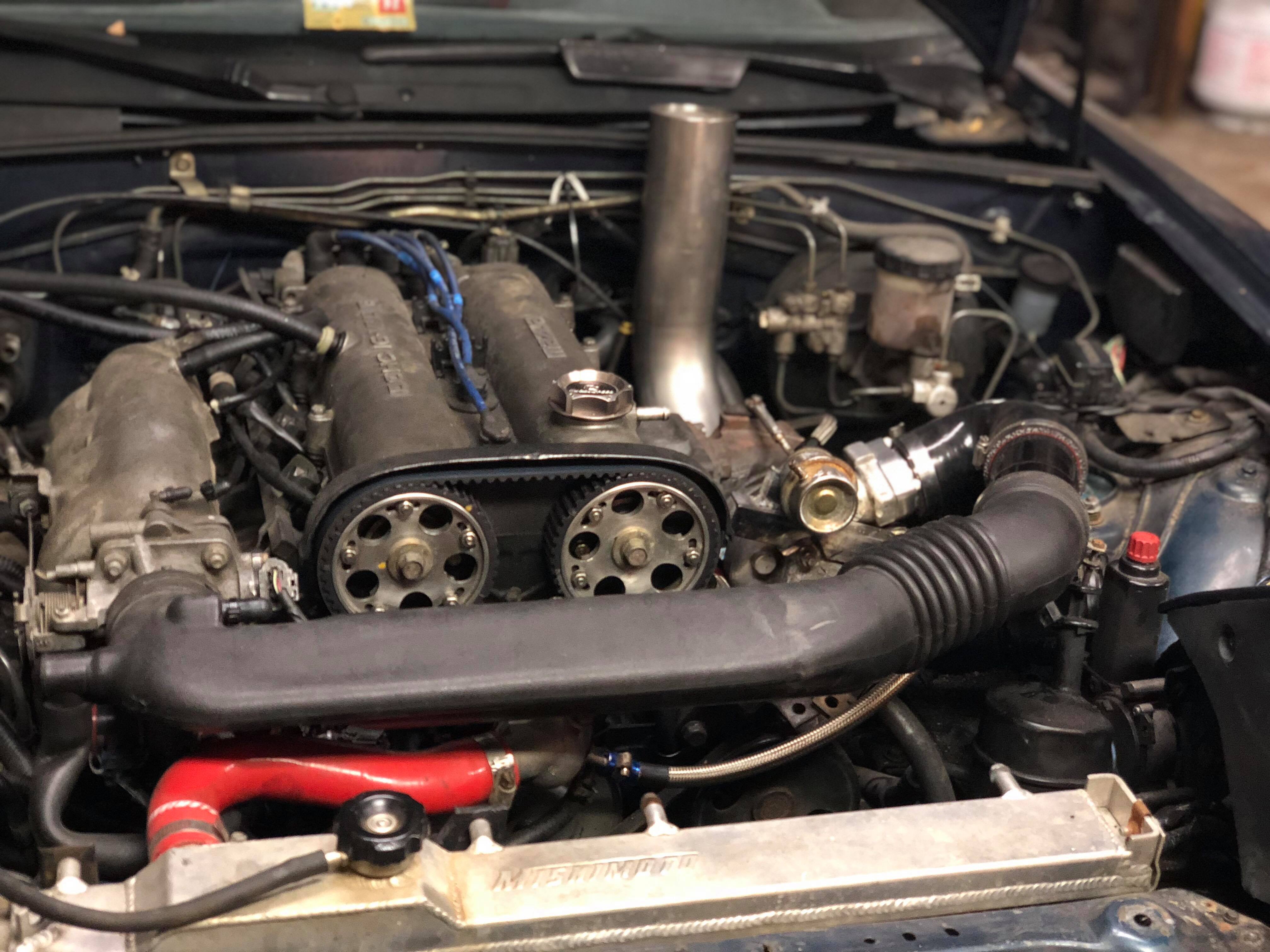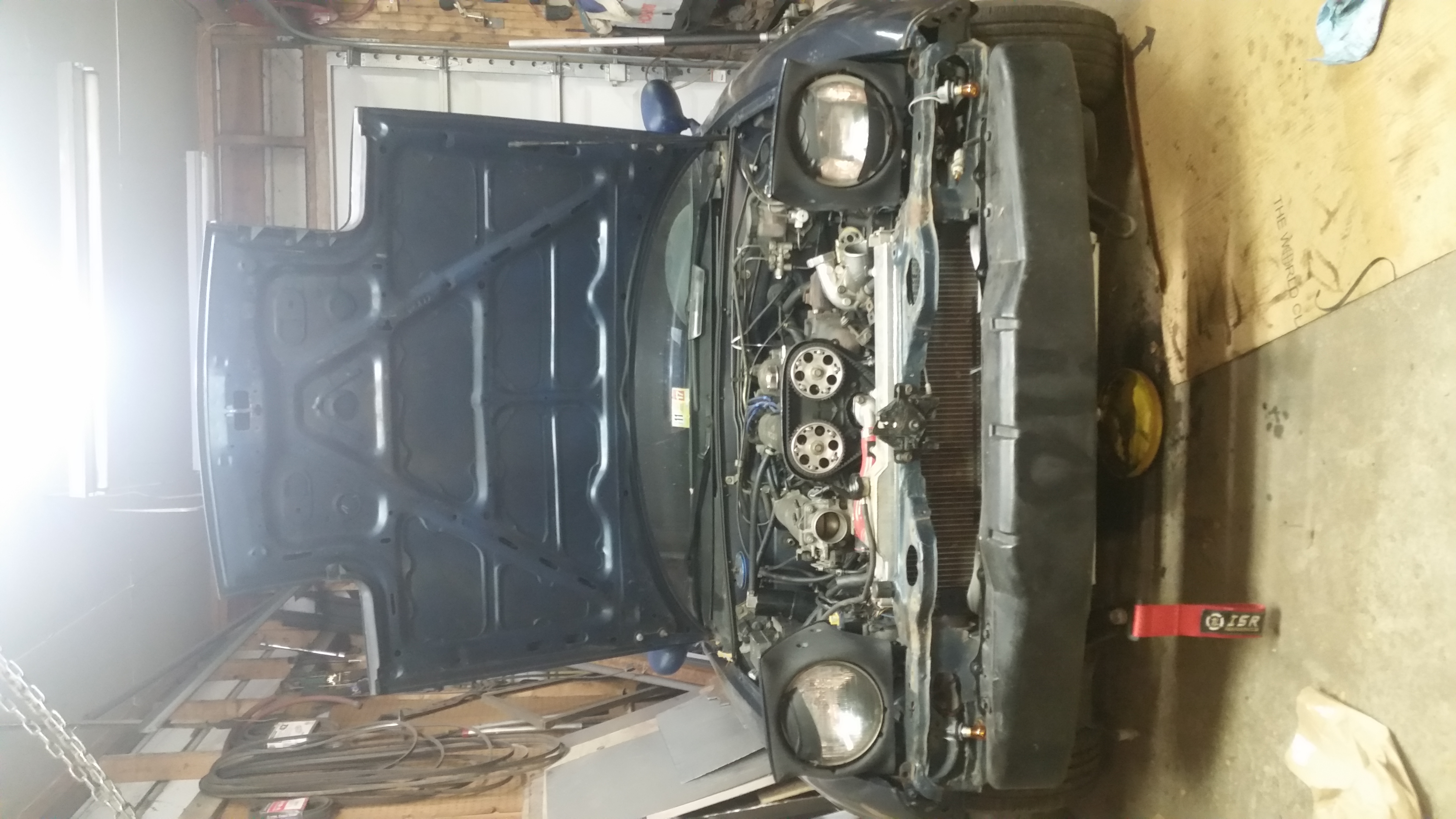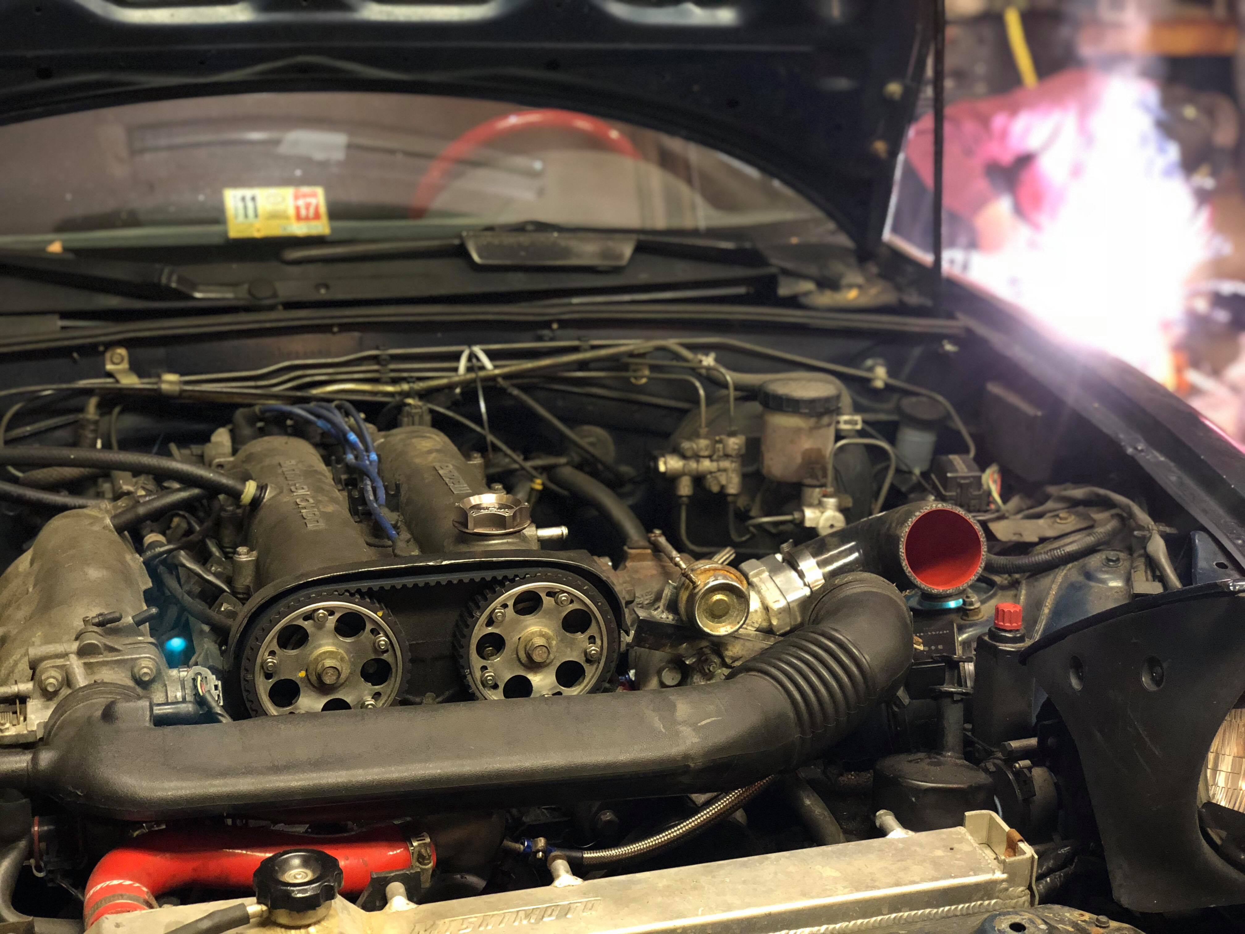 I may as well since I got the kia housing and hose when I bought another head from a friend. Picture dump sonce a friend wanted to try out his new iphone x. Yes I told him not to take pics of welding. Ignore the crossover tube that is extremely temporary. Also just curious to see if anything happens to it for the time being until I source fmic piping from a buddy. The last two oil feed fittings are going to be here on the 27th so let's see if I can get it running "properly" before New Years! 3" stainless hood dump is going to be made and installed after I manage to get an inspection 😬