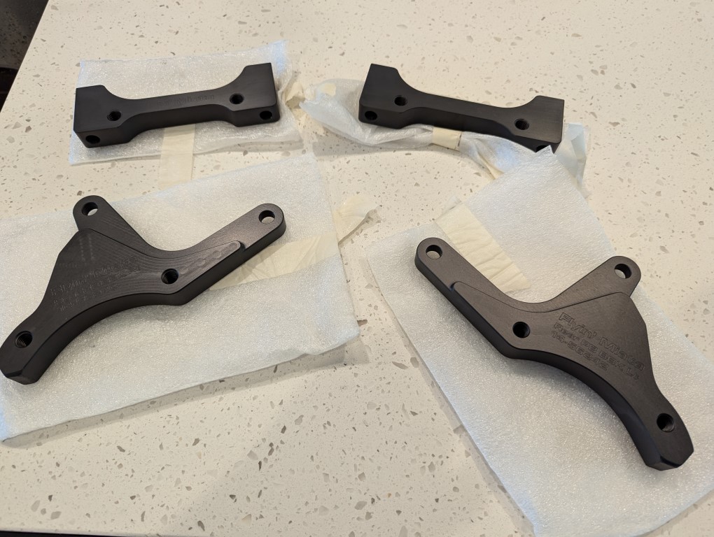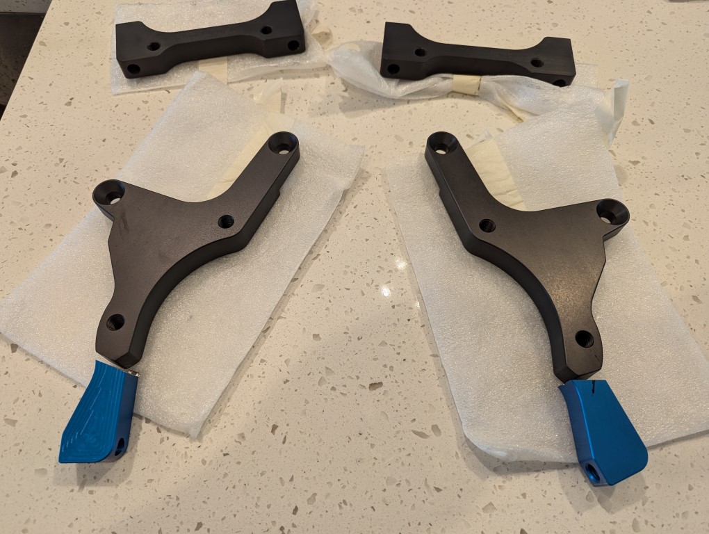 Brackets complete after anodizing. You can see bottom edges with a bevel, that is to clear that weld in the knuckle. Fit was still close.