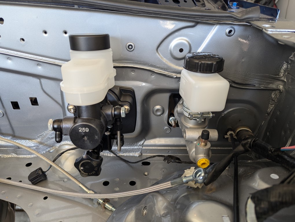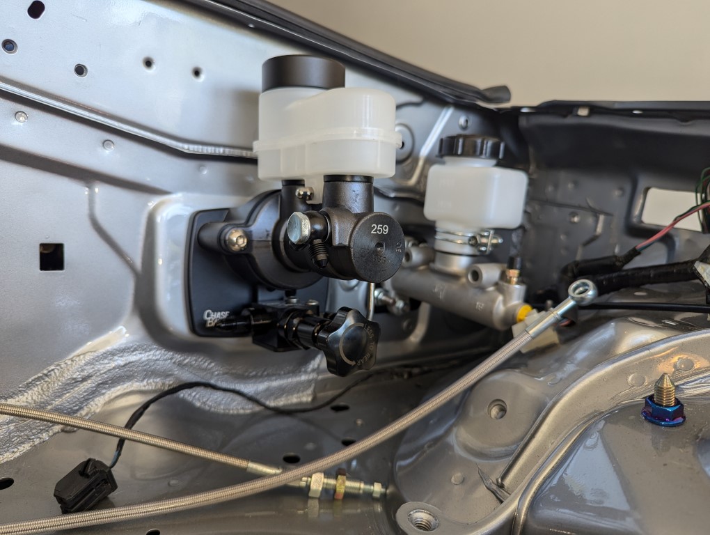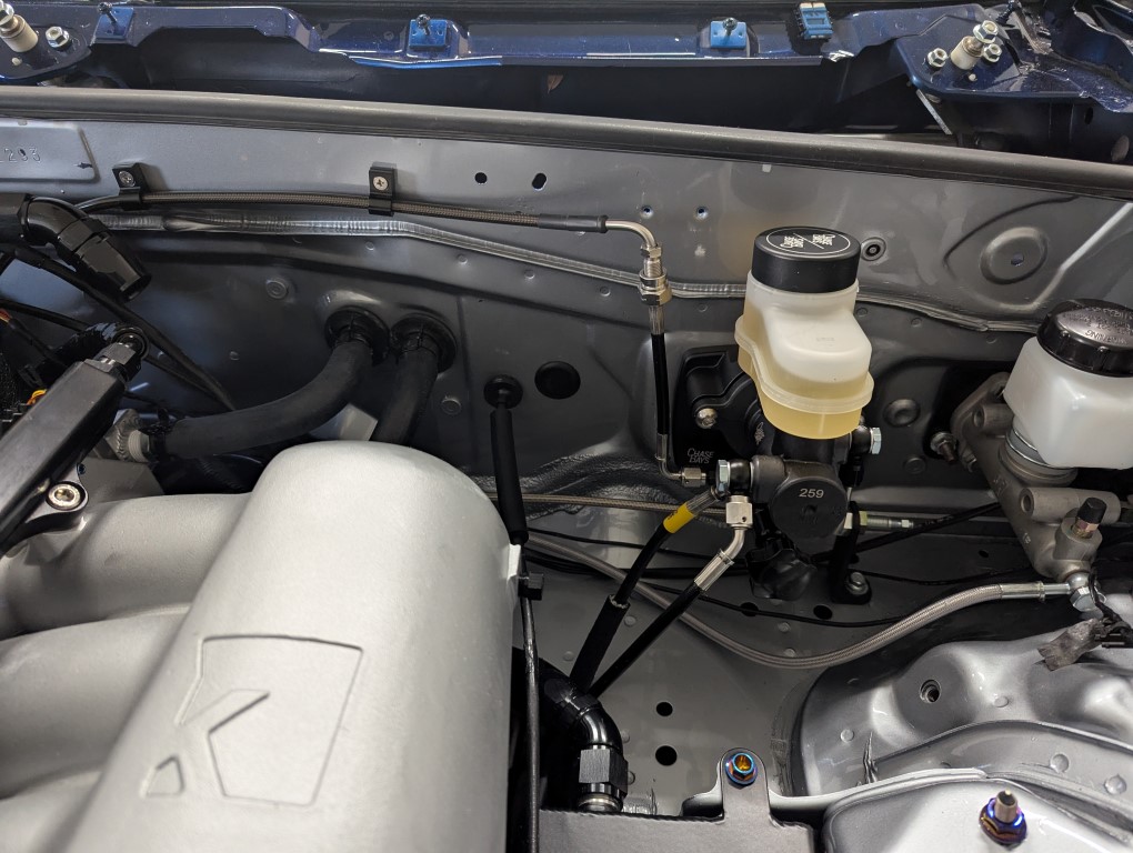 Used the Chase Bays Dual Piston Brake Master Cylinder (which deletes the brake booster). Also used their hardline replacement kit to move everything to soft lines. The only hardline left on the car is the one that attaches to the rear subframe connecting the left and right sides.