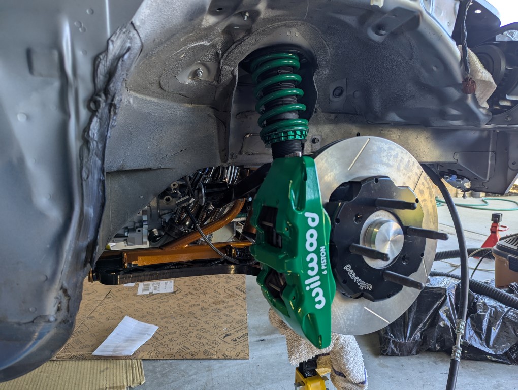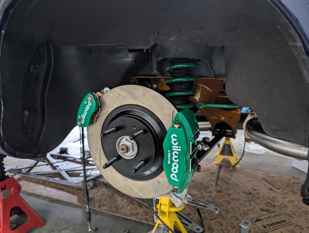 Here are the brakes mounted. I worked with Wilwood to exchange the FM Calipers so I could get the color I wanted. They were very helpful! I really wish FM would partner with Wilwood more and just allow people to order them factory direct. So many color options. I chose competition green.