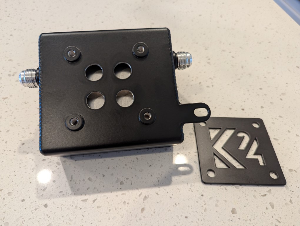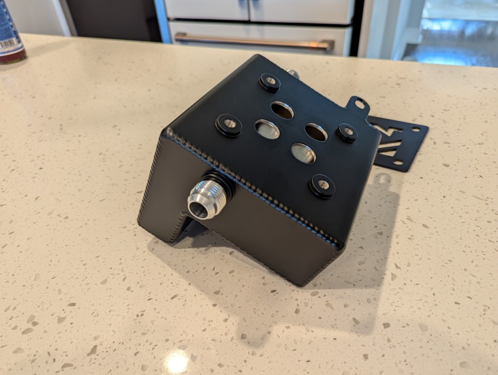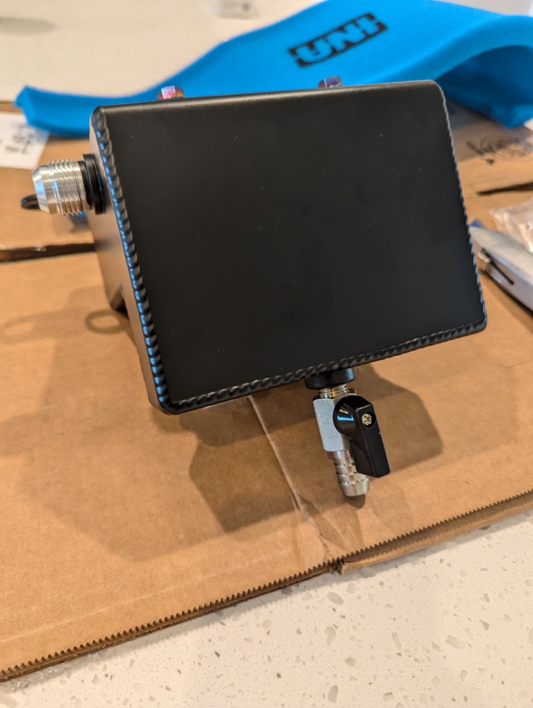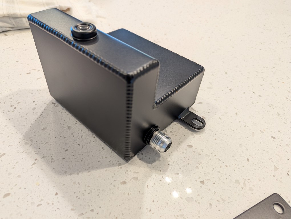 Picture of the custom catch can build by Snail Fab ( google Snail Fabrication if you're interested.. he's on facebook ) Guy did a great job and price was more than fair. It has 1/4 NPT fitting at the bottom for a drain as well. Also a single baffle inside to keep oil from the filter element. I had it powder coated in matte black.