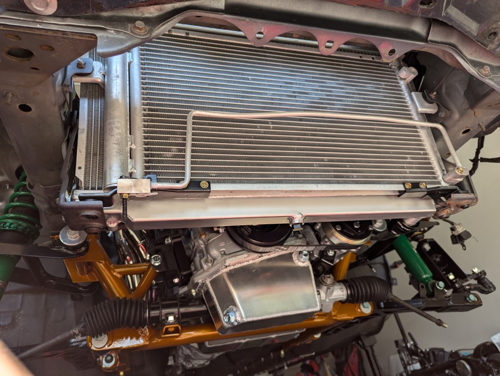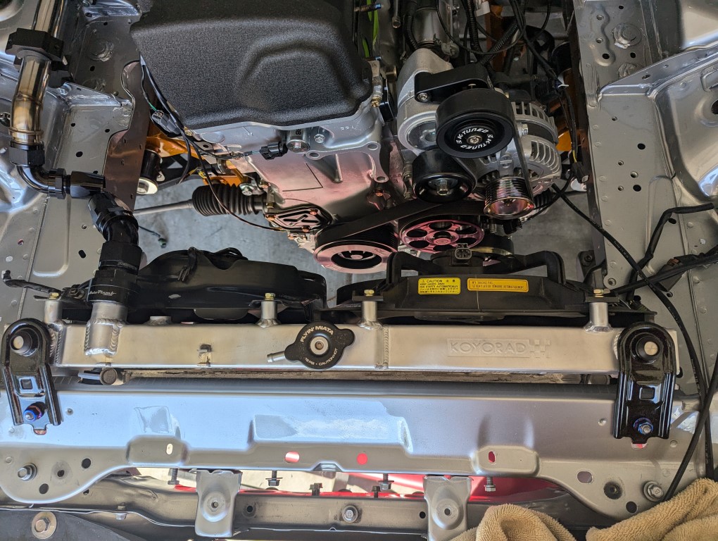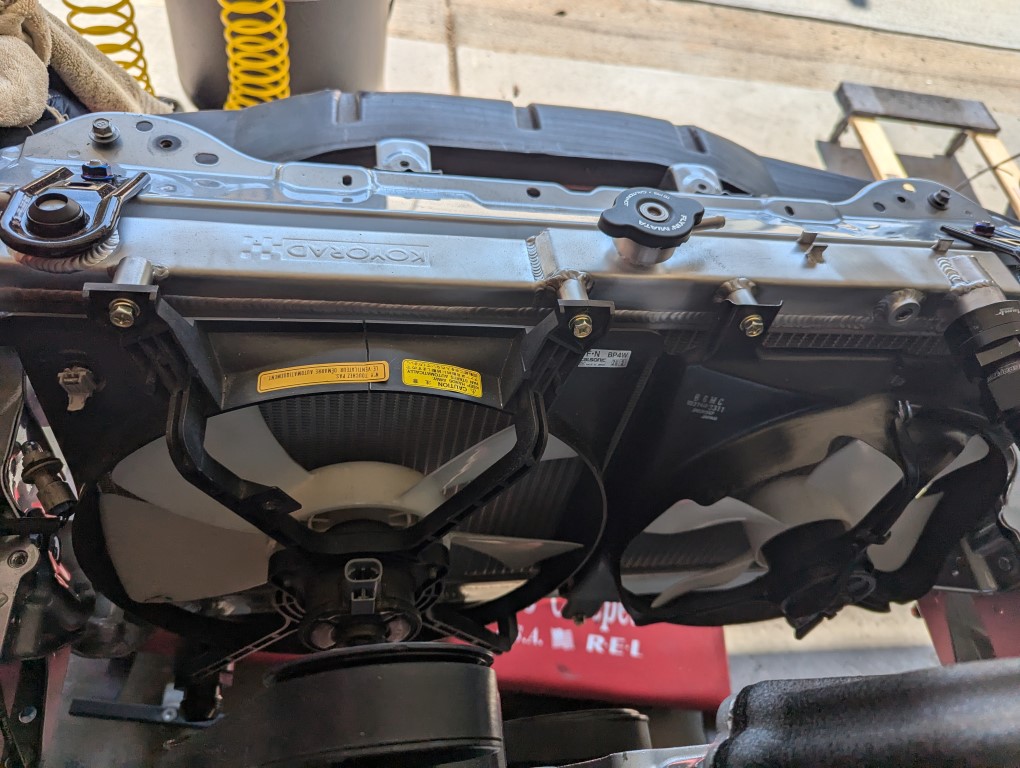 Radiator is the 36mm Koyo Hypercore. Was planning for a crossflow, but this car will not be tracked regularly, so this will do. Fully disassembled and cleaned the OEM fans as well.