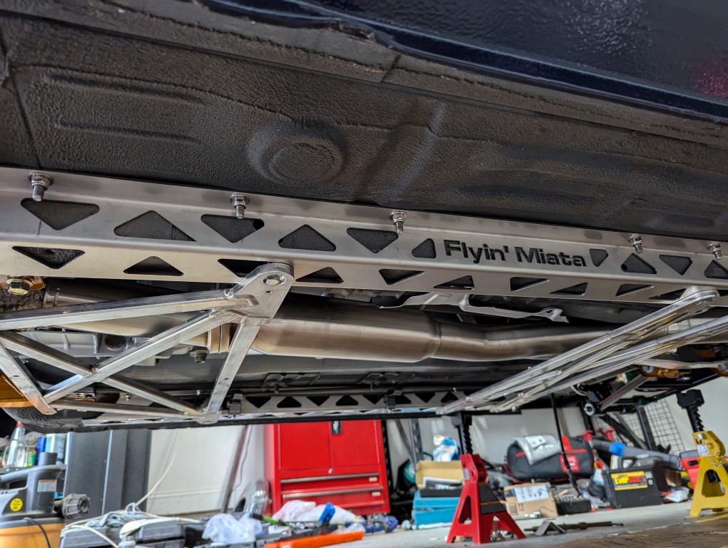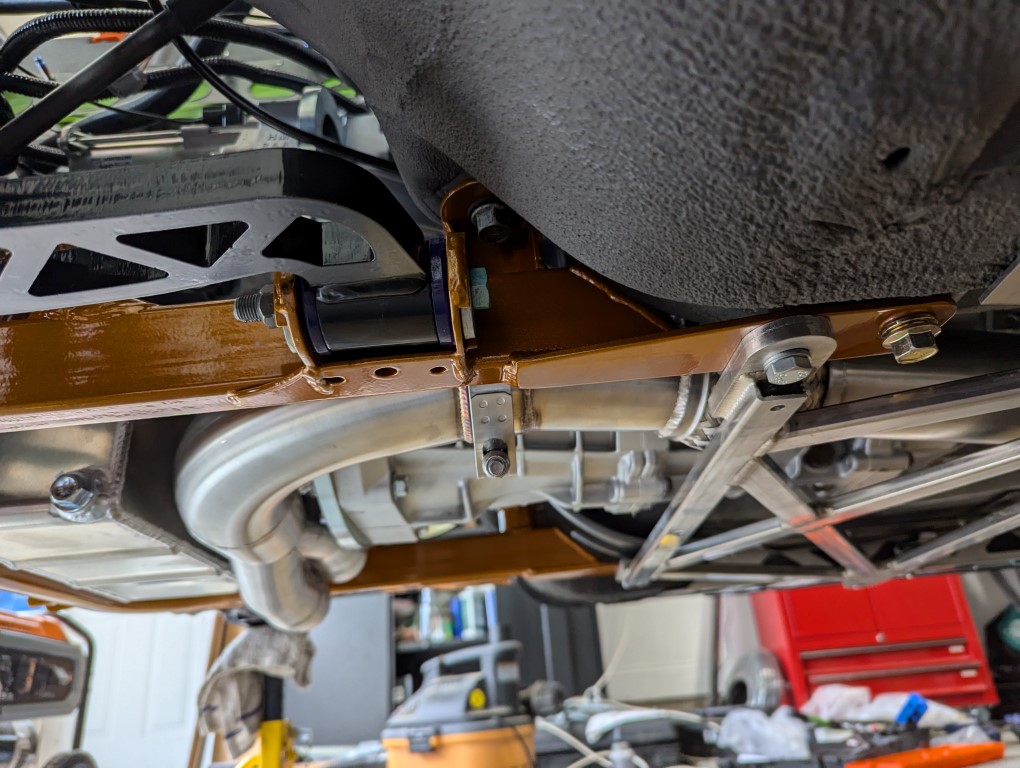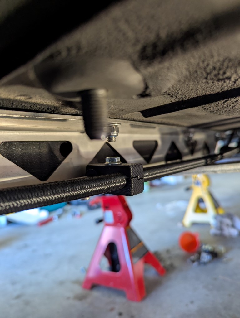Her is a pick under the car of the bracket and fuel line in the front. Had to use an AN to quick connect adapter to use the OEM connector. I'm a little worried about that connection not leaking. We'll see.