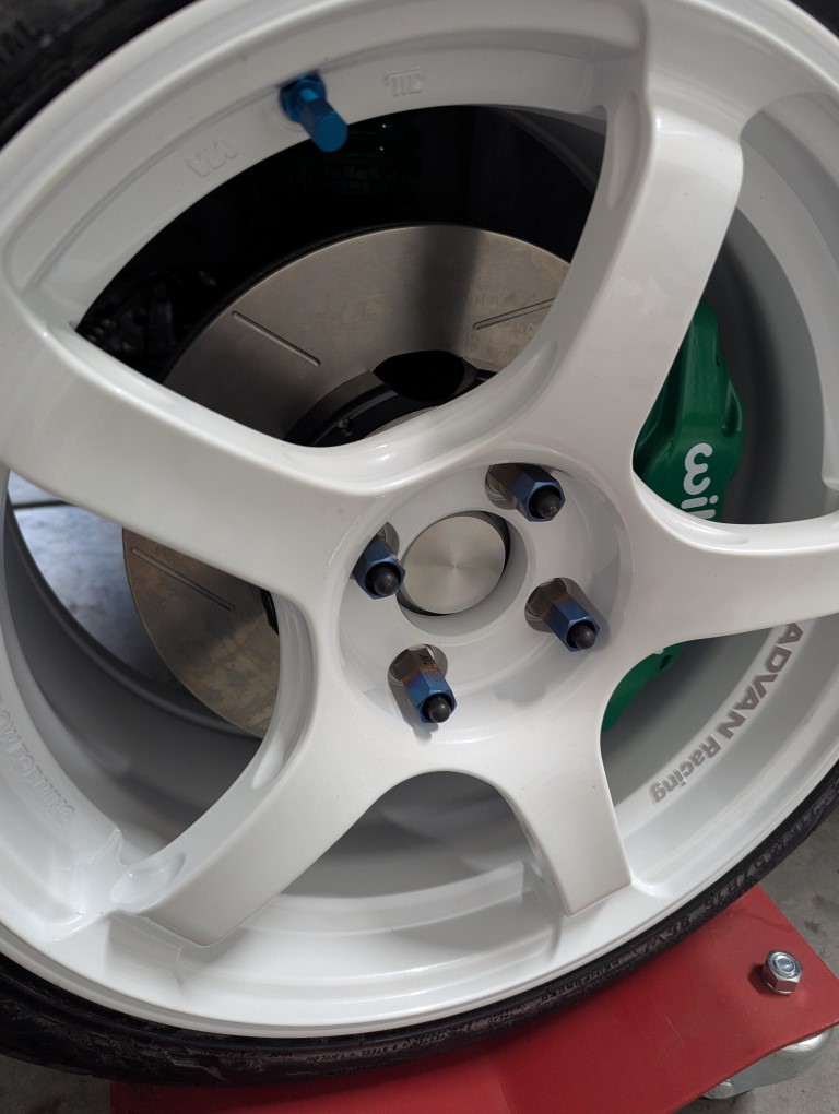 Here's a pic of the Advan TC4 wheels with titanium lugs (16 x 8 + 38).