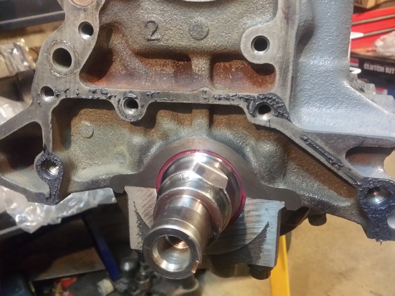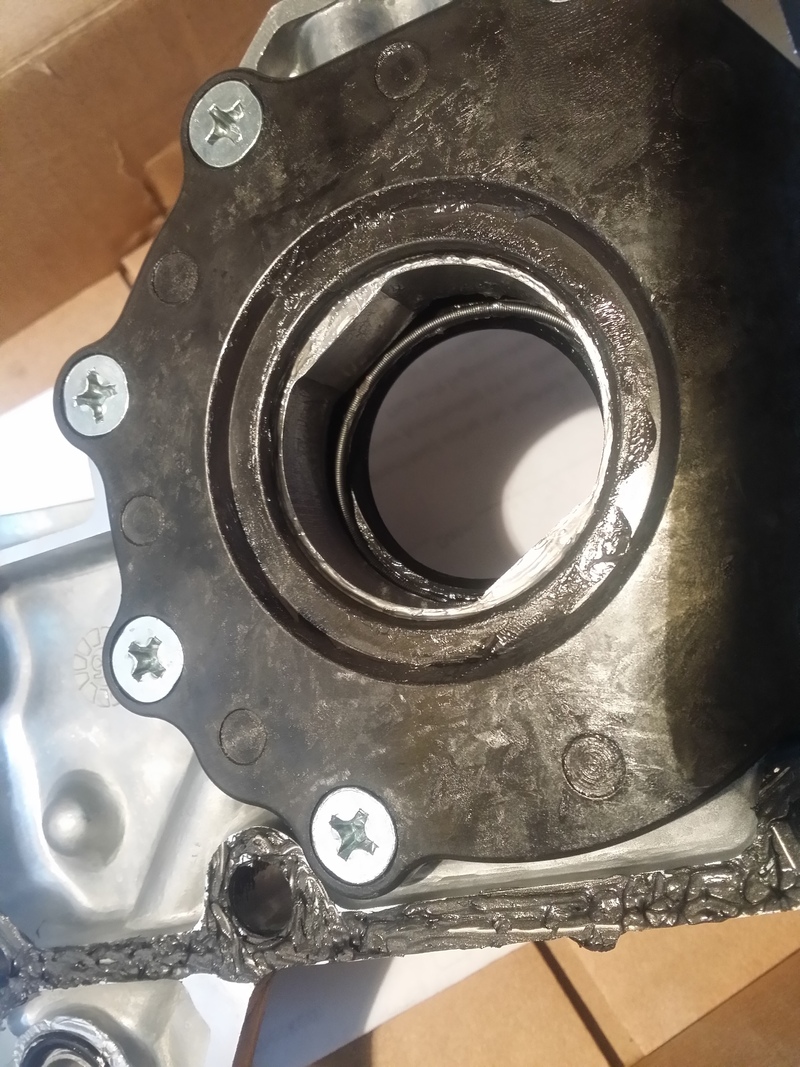 Put on the oil pump for testing a few times which was probably the demise of the shaft seal. Then I RTV'd it all for its final assembly and went to put it on and noticed the seal got caught, then the spring came off. Not going to chance it so I will get another seal. When I took off the pump I could see where the RTV did not make it. I tried to use as little as possible so them I added some more and bolted it in. BTW there are only 5 bolts holding the pump on right? I checked the FSM but didnt see how many??