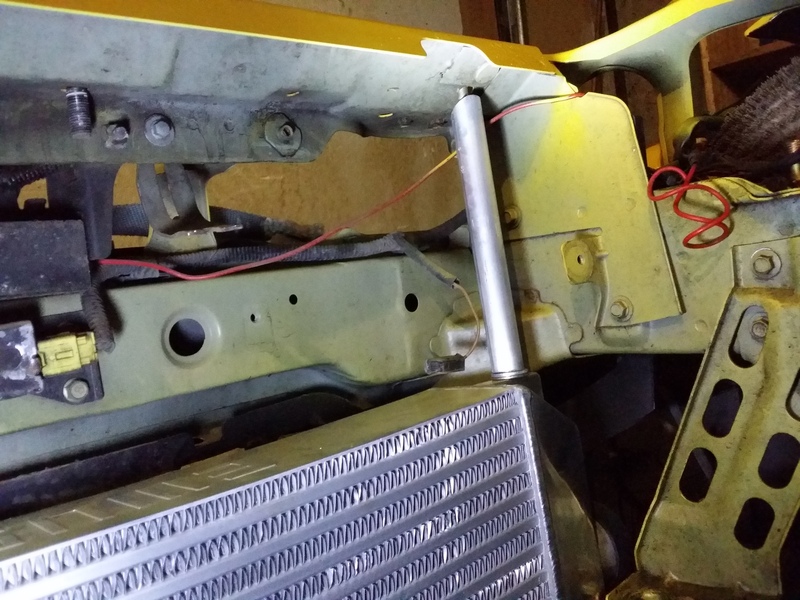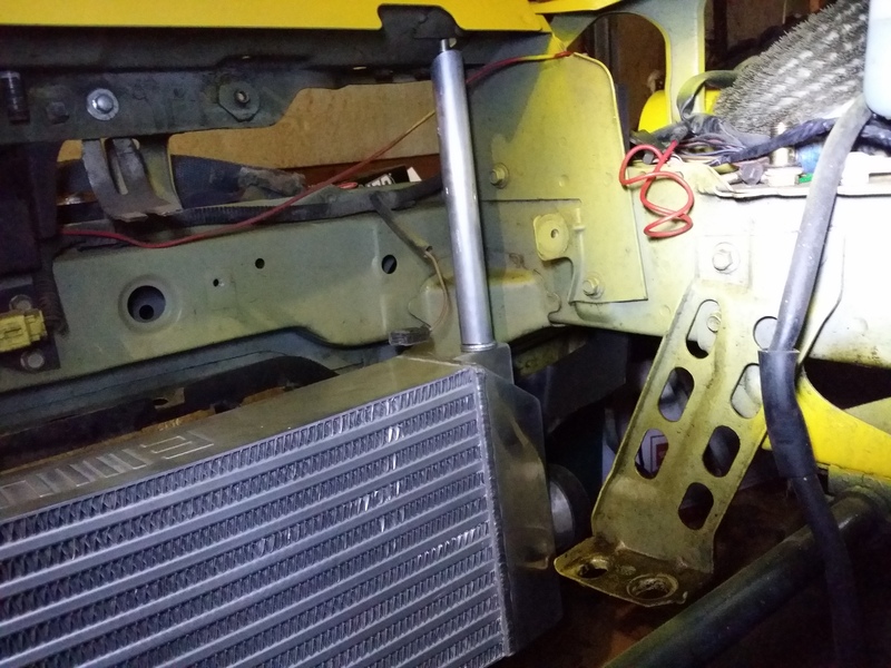 My ebay intercooler came with vertically placed M8 threaded holes at each end. I decided to take advantage of these and the holes relating to the radiator mounts and mount it using them. At first I was going to use long sections of threaded rod, then I thought that was to archaic looking. I decided to try some aluminum rod. Went with 7/8 6061 rod @ $17CDN for 2 feet. Each piece I drilled and tapped and then cut one end at an angle to match the top body frame holes. I used the cutoff peice to make an angled top washer. Yes they are thick but they only weight 240 grams each rod. They look unique and are very strong. Guy at the bolt supply house suggested a long 40mm set screw instead of a threaded rod to use to mount them to the IC side. Worked like a stud. Locktited the stud to the rod and used a bit of RTV on the IC side of the stud. Had to do some final adjustments but I like it.