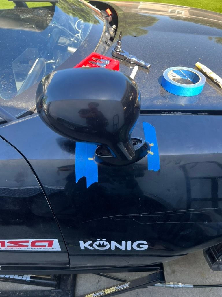Today I tackled a project that I planned to leave until the next event - set up a usable passenger side mirror. From my seat, with the halo seat, I can't use the stock passenger mirror - it's out of my line of sight. So I moved it to the front fender. I copied the hole pattern onto some painter's tape and after much back-and-forth setting and checking the location of the mirror, set it up on the passenger fender. I only ended up using it for locating the center hole for the mirror - a 7/8" hole with a little bit of de-burring turned out to be a nice tight fit for the extended boss on the mirror base. From there I did more back-and-forth to the driver's seat to orient the mirror correctly. The base ended up at a more extreme angle to the fender than it was originally, but this is what it takes to get the mirror to where I need it.