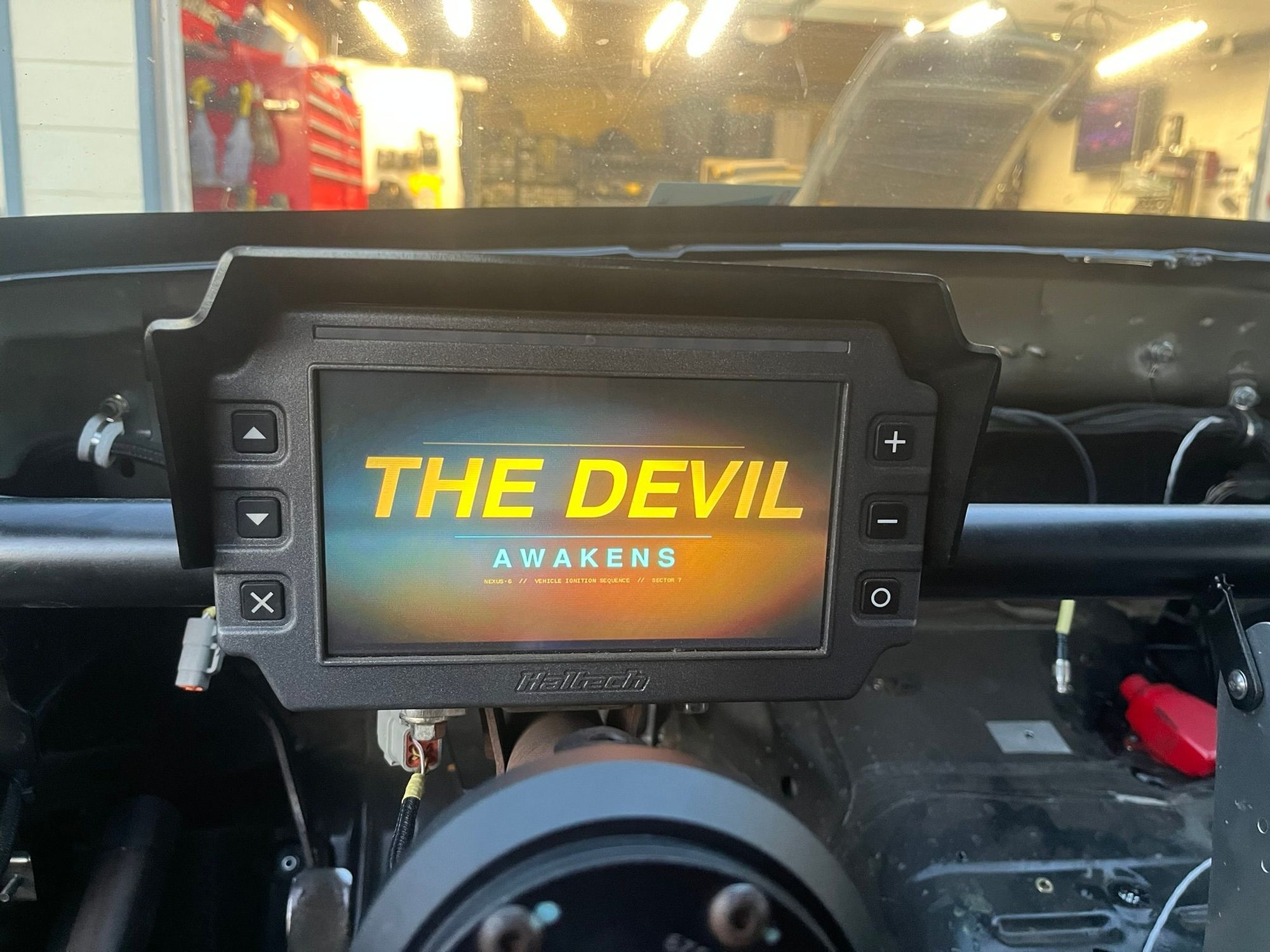 I brought out the laptop to double-check my work and update the dash firmware. Haltech now allows you to change out their generic boot screen for your chosen image. I've been working on a custom gauge set (also a new feature) and created a quick boot screen that shares the theme/palette with my unfinished gauges. I gotta say, it's really cool. Stupid, but cool. "The Devil" is the name I gave this car back when I bought her as transportation in ... 2005?