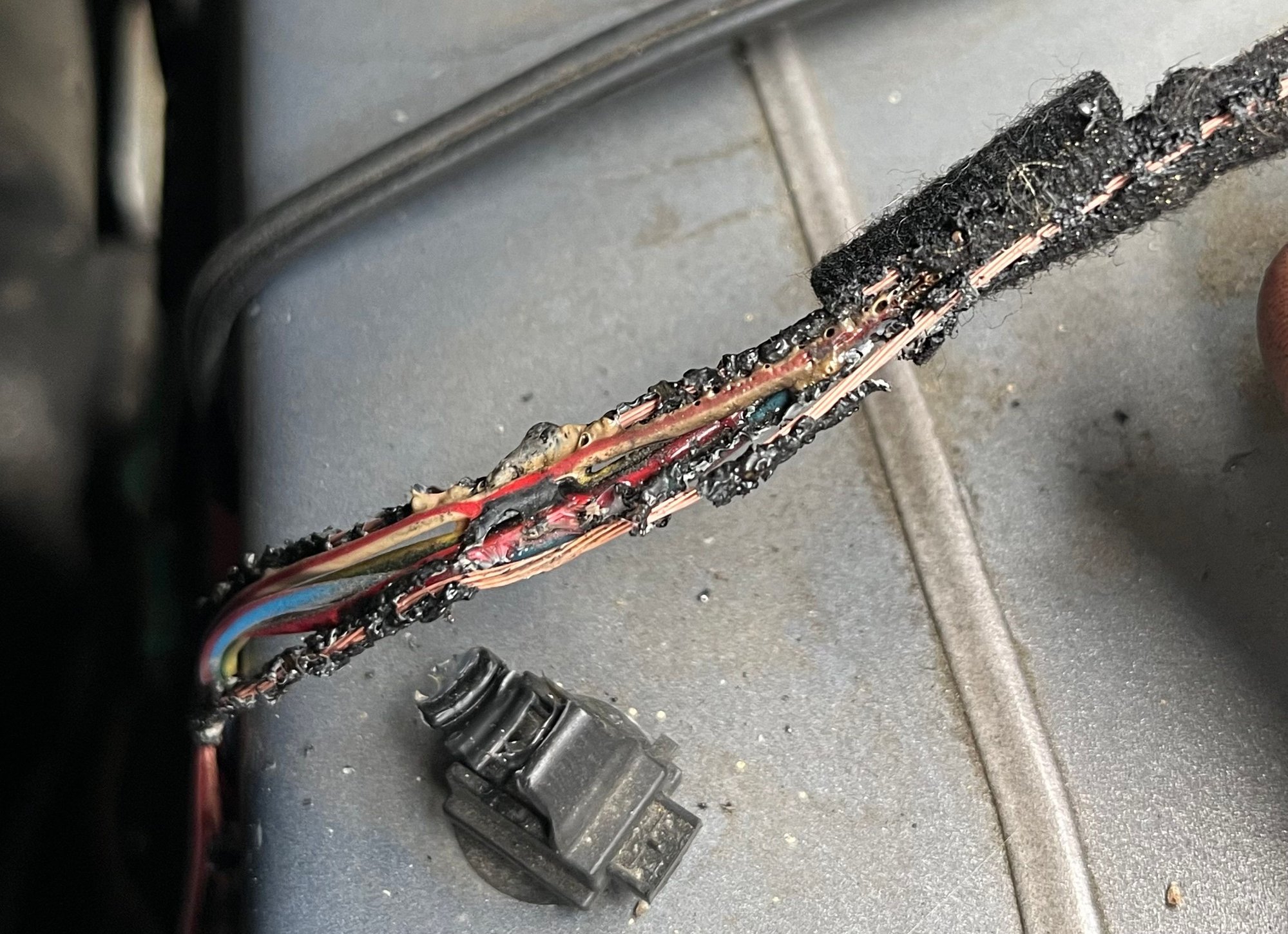 Oh yeah, that uhhhh... might be an issue. How the heck did I not smell that? The wiring to the leak detection pump was completely melted all the way from behind the passenger seat to the connector of the pump outside of the car.