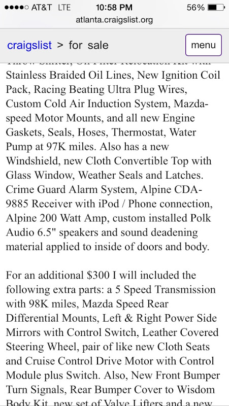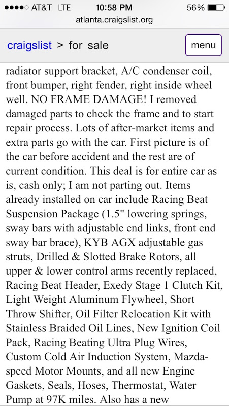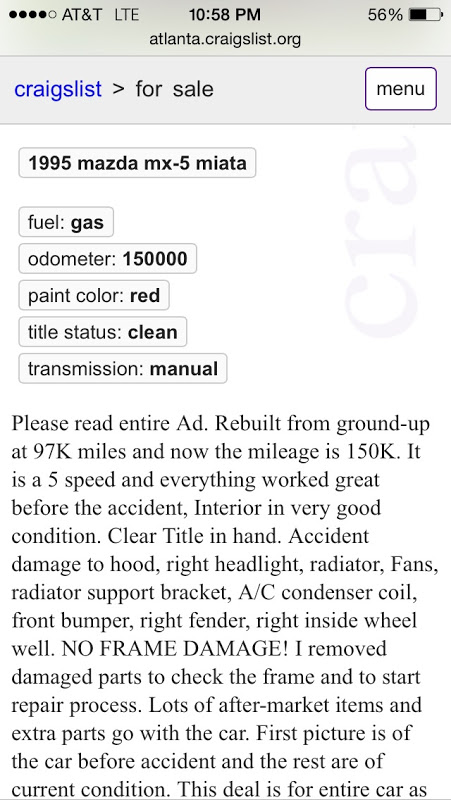 My target car was one that already had some nice mods (suspension mainly), as I knew that would keep the total cost down. I was also targeting a car that either had light collision damage or was cosmetically undesirable, as I figured the asking price on these would be closer to my price range. The car I found was the perfect candidate – lovingly maintained, nice modifications, a pile of spares, and a reasonable asking price. We settled on $1500 for the car + spares. Some screen shots of the craigslist ad: