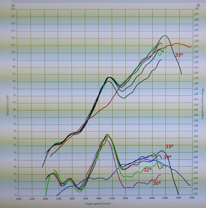 Another result was that the CR of 11.8:1 is too low for the cams/overlap 12.5:1 would be better. The analysis here is based on the fact that it responds to ignition change from 34 to 35°, it should not need more than 30-32.