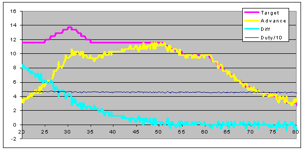 Third showing the most common behavious, not enough oil to get the advance down low but after 4kprm there is no problem reaching the target.