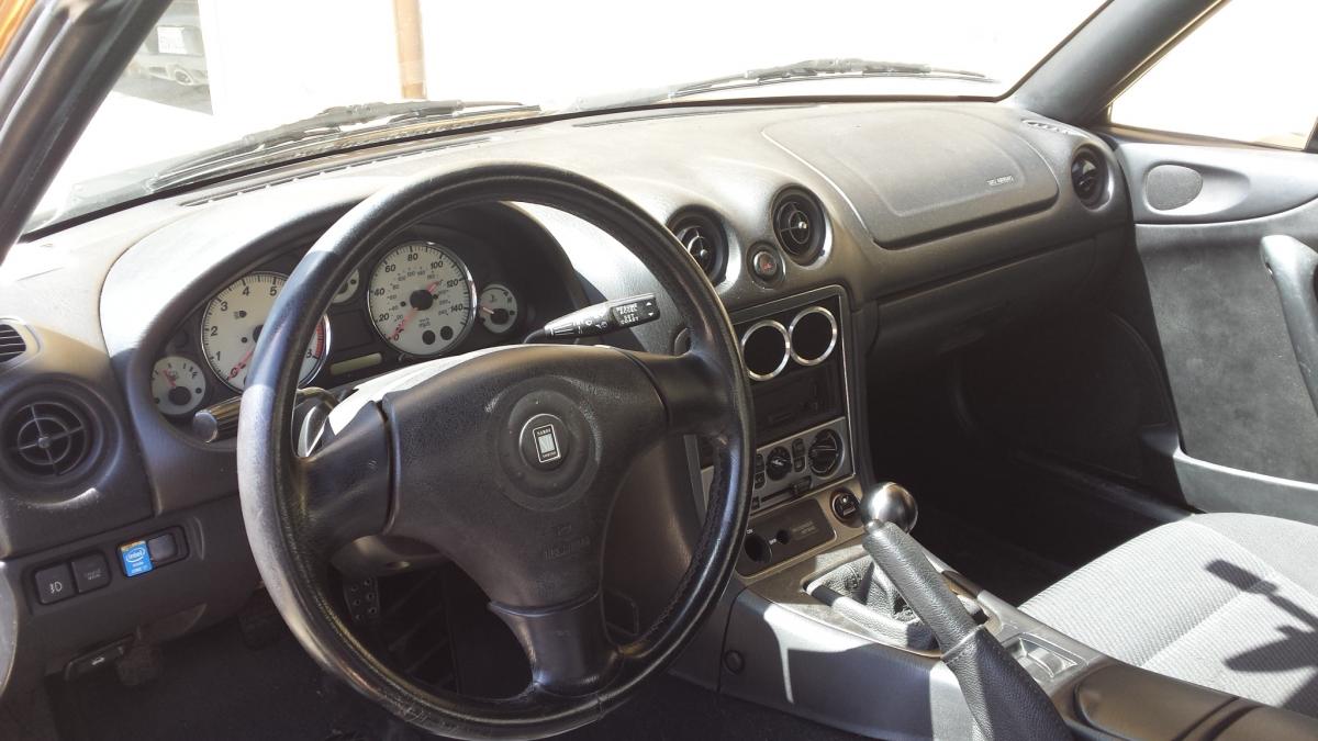 Our story opens already in progress. The car is an NB1 2000 Mazda Miata in 18K Evolution Orange: Bare Bones Edition. (That's right, its a factory color. One of 646 produced. 10AE owners, eat your hearts out.) It started life with a 5 speed, 4.30 open diff, AC, PS, stock NB 14" rims and fog lights. The car had (IIRC) 101k on it when purchased. It was 100% untouched, other than the thrashed fabric on the drivers seat. So untouched that it still had the Panasonic battery in the trunk.