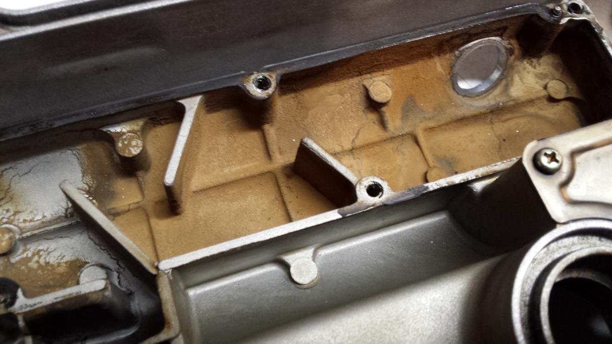 I pulled out the donor valve cover and started cleaning it up. I popped out the PCV grommit and some unexpected weird brown **** came out. In a fit of OCD I removed the baffles and discovered this: