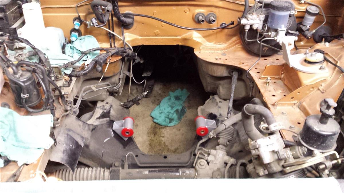 The front (and apparently rear) main seals had been weeping for quite some time, so there is A LOT of **** on the subframe and tunnel. It was very late (or early, can't remember) so in the interest of time, it was decided to not worry about cleaning things this time around. Thus no Floor and Tunnel Shield this time around either. Also shown: 70D engine mounts.