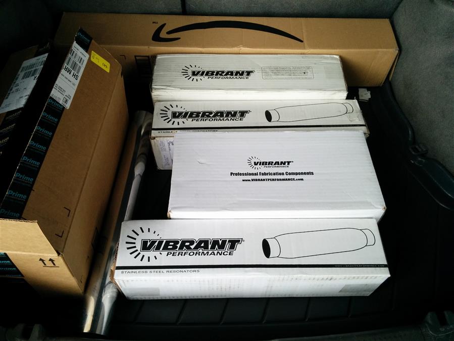 Gesso is awesome and is going to let me play with tubes in his garage this weekend, so possibly exhaust updates forthcoming. I just bought ALLTHERESONATORS! that Vibrant makes in 3" via Amazon Prime. The plan is to fit the biggest one possible in there and return what does not fit. Because I want a resonator, and I'm insane. Obviously.