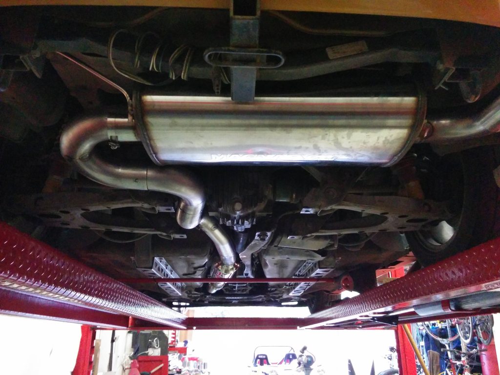 Clever muffler mounting trick is clever. This gave us the support needed to figure out where to put the hangers. Not sure where Gesso saw that but holding up the giant magnaflow would have been a challenge without it.