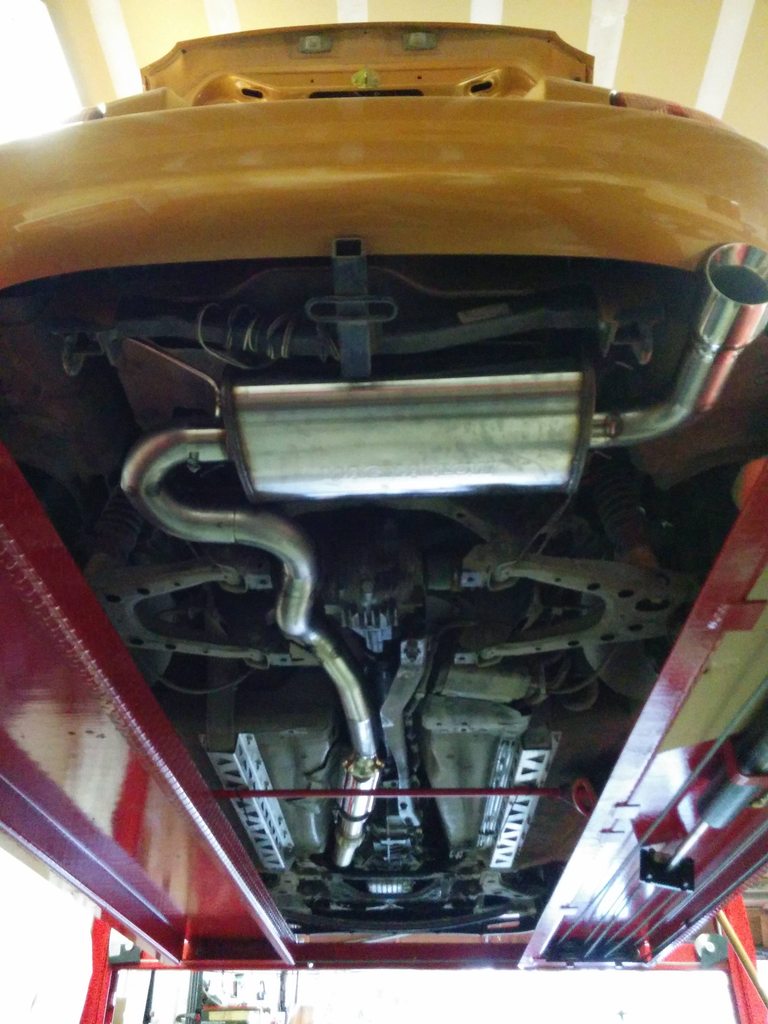 Little lower angle for you. I was not sure that big *** 5" OD resonator was going to fit, but Gesso said we could do it, so we did it! You can see the flex joint in the ARTech downpipe just ahead of the resonator body.