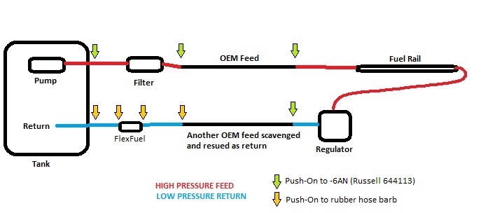 <br /><br />Stock push on fittings don't see 90psi of fuel pressure (60psi base+30psi boost). I did some searching and couldn't find a single mention of pressure ratings on those things. Probably going to call doorman tomorrow.