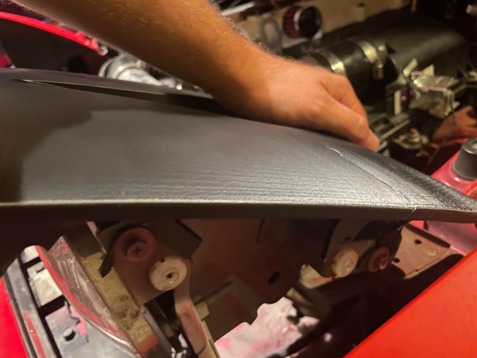 My idea was to have an intake isolation box that would only take in cold air and could quickly be repurposed to feed a turbo once I boosted the car. The only way I could tick all of these boxes was to make have the isolation behind the driver side headlight and have it be fed by a TSI and NACA duct on the headlight lid. I got some carboard and made the base of the box so I would know the general outline, after that I got a larger piece of carboard so it would all be one piece. I cut it so it was about 1-2 inches below the bottom of the hood,, then I put a toothpick into each vane of the cardboard and then shut the hood, which pushed down all the toothpick and gave the exact shape I needed of the underside of the hood. I then traced this out onto another piece of cardboard, checked to make sure it fit, then used it trace out what I needed to cut out of metal. I then folded the metal, cut the hole for the intake tube, and made some brackets to hold it in place. I put some weather stripping on the top and some nomex tape on the bottom of the airbox so it would seal better (and not rattle as much). This additional material on the top and bottom made it not fit perfectly, but I only had to trim it slightly to keep the perfect seal. I put a layer of grease on top of the weather stripping and then closed the hood to check where the weather stripping was/wasn't making contact and then trimmed the airbox, and then repeated the process until it sealed perfectly again.
