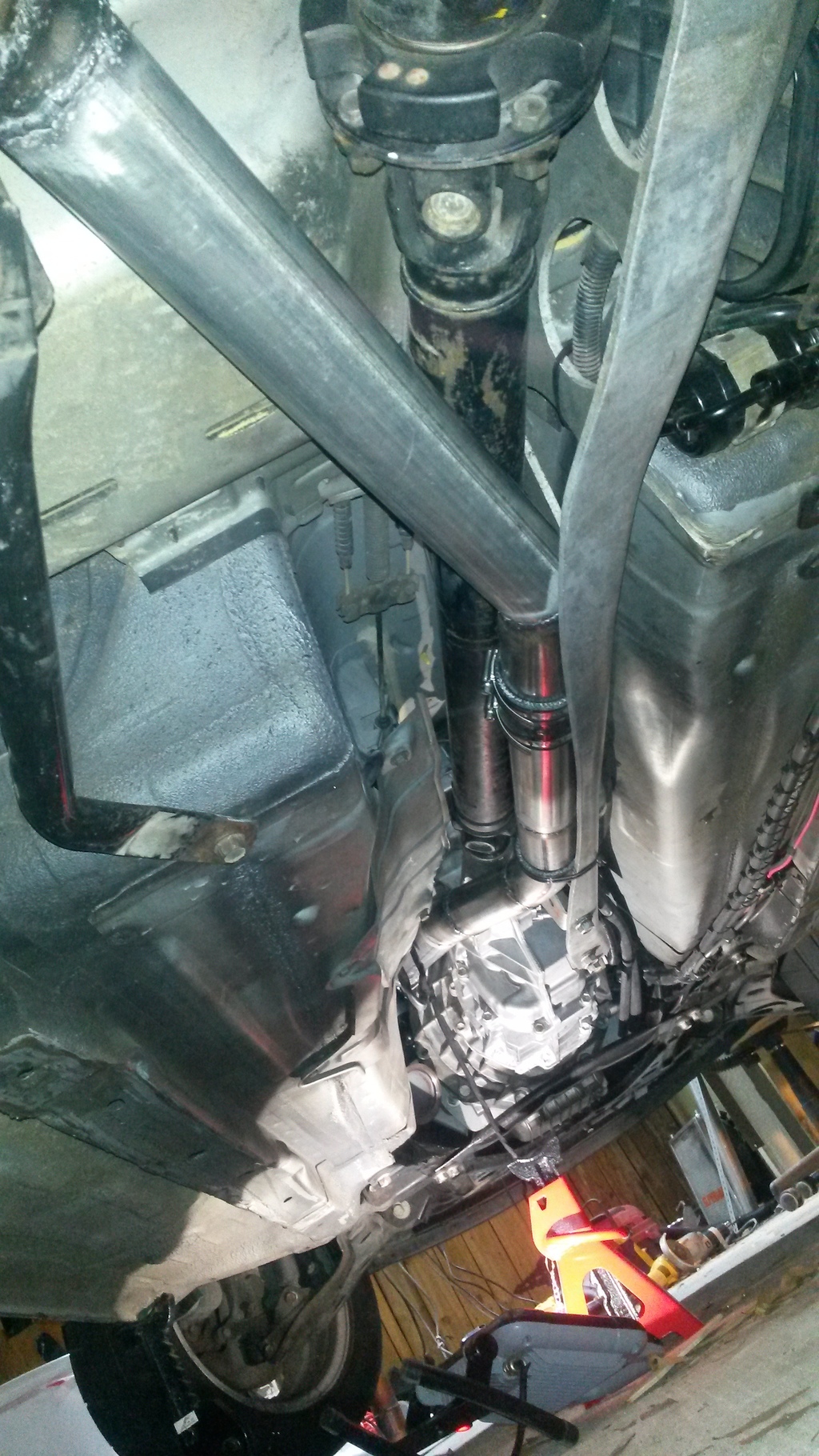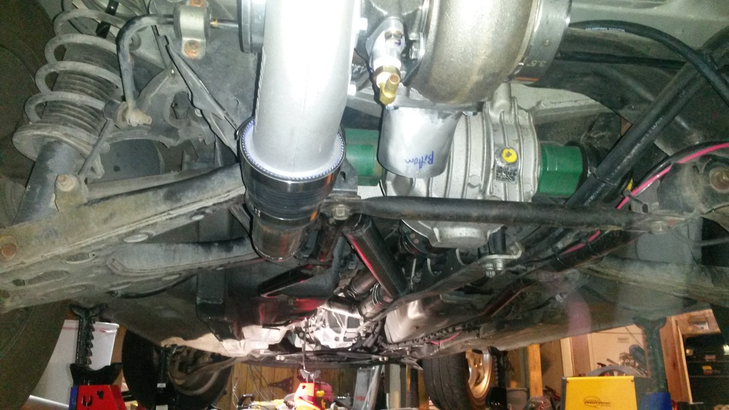 You should be able to have the exhaust come straight out of the rear turbo all the way towards the passenger side then u-bend into a MagnaFlow across the back and driver's side rear exit. The oval shaped MagnaFlow can be mounted with the body turned with the narrow edges top and bottom if necessary for fitment (like some '69 Firebirds/Camaros).