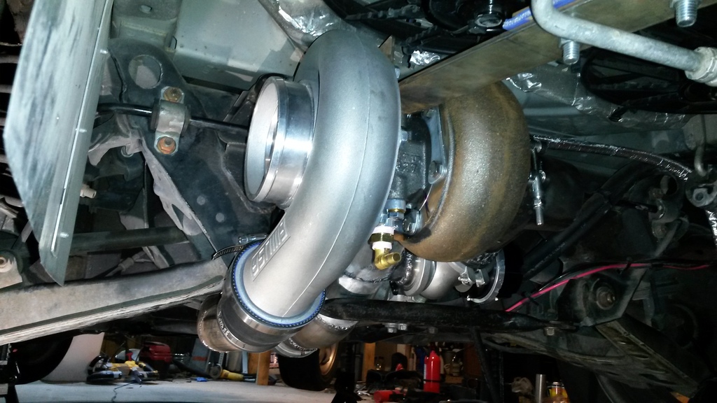 Pics kinda tell the story, but exhaust is done all the way till rear turbo, and out 3" out the big turbo. Will order a cat and muffler soon to finish that up. More on exhaust later.