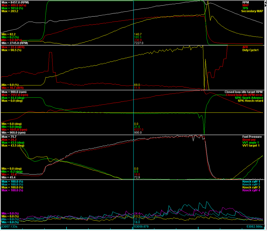 I assume MAP is pressure at the manifold and Secondary MAP is between the turbos? It's interesting to see how the little turbo kicks in, then as the big turbo comes alive the little one seems to go away.
