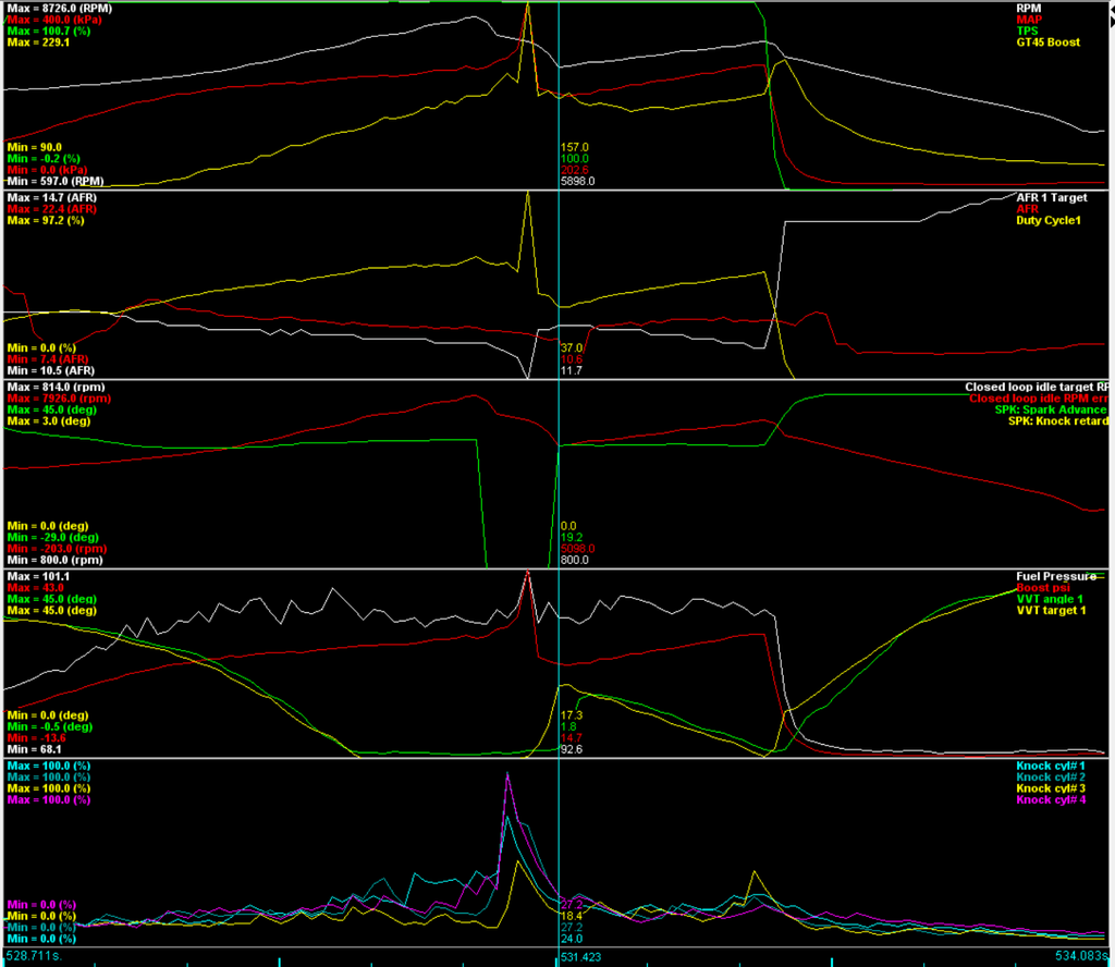 To reduce shock loading on the entire drivetrain during shifting, I need to reduce engine power to almost nothing during gear changes. Like this. There is no visible RPM bounce after the clutch is out on this shift. And I run zero smoothing on my RPM trace (and almost every sensor really since that can mask problems).