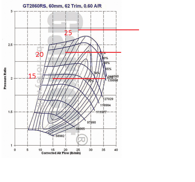 This is the GT2860 plotted on my setup for 15, 20, and 25 PSI.
