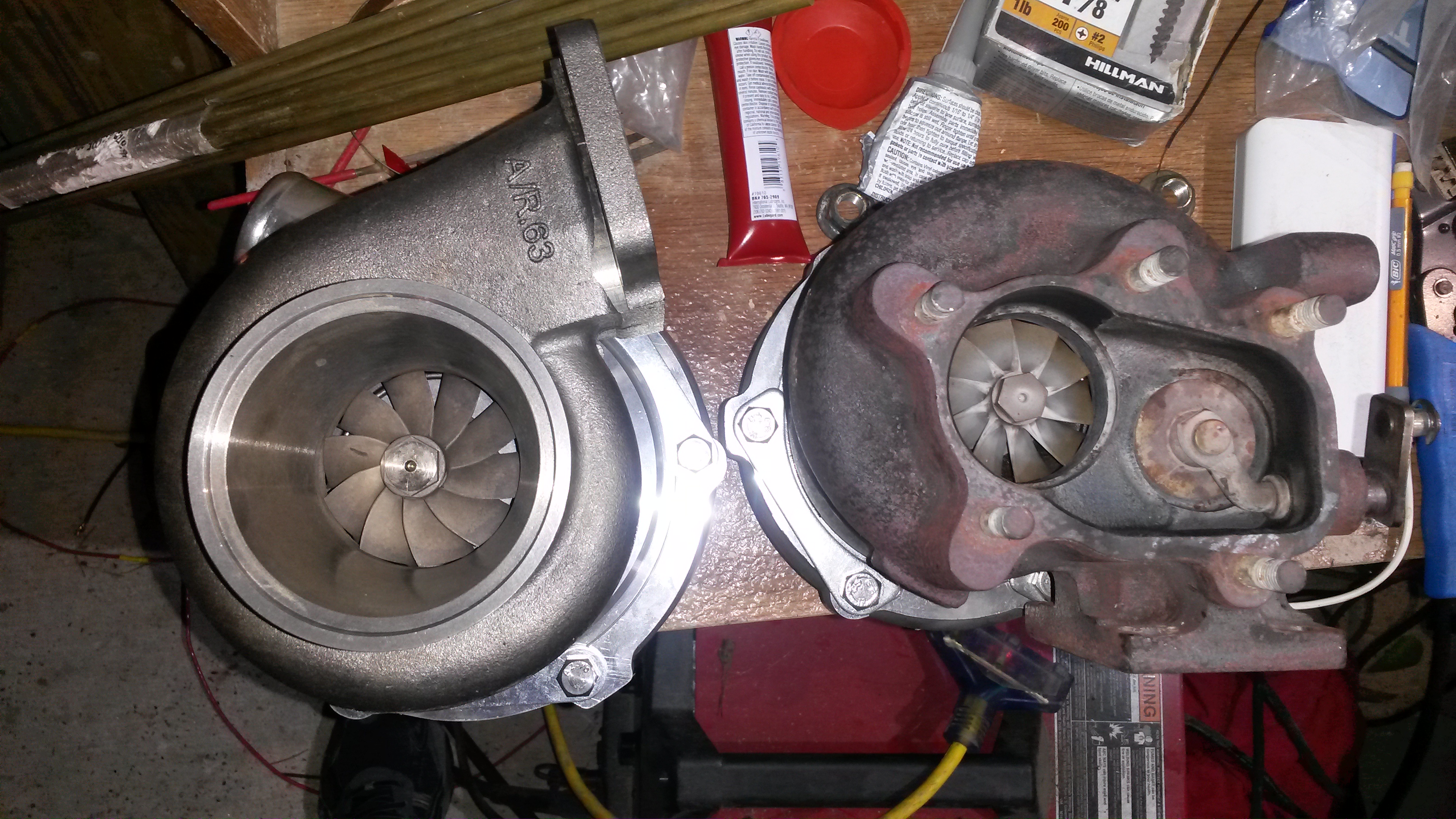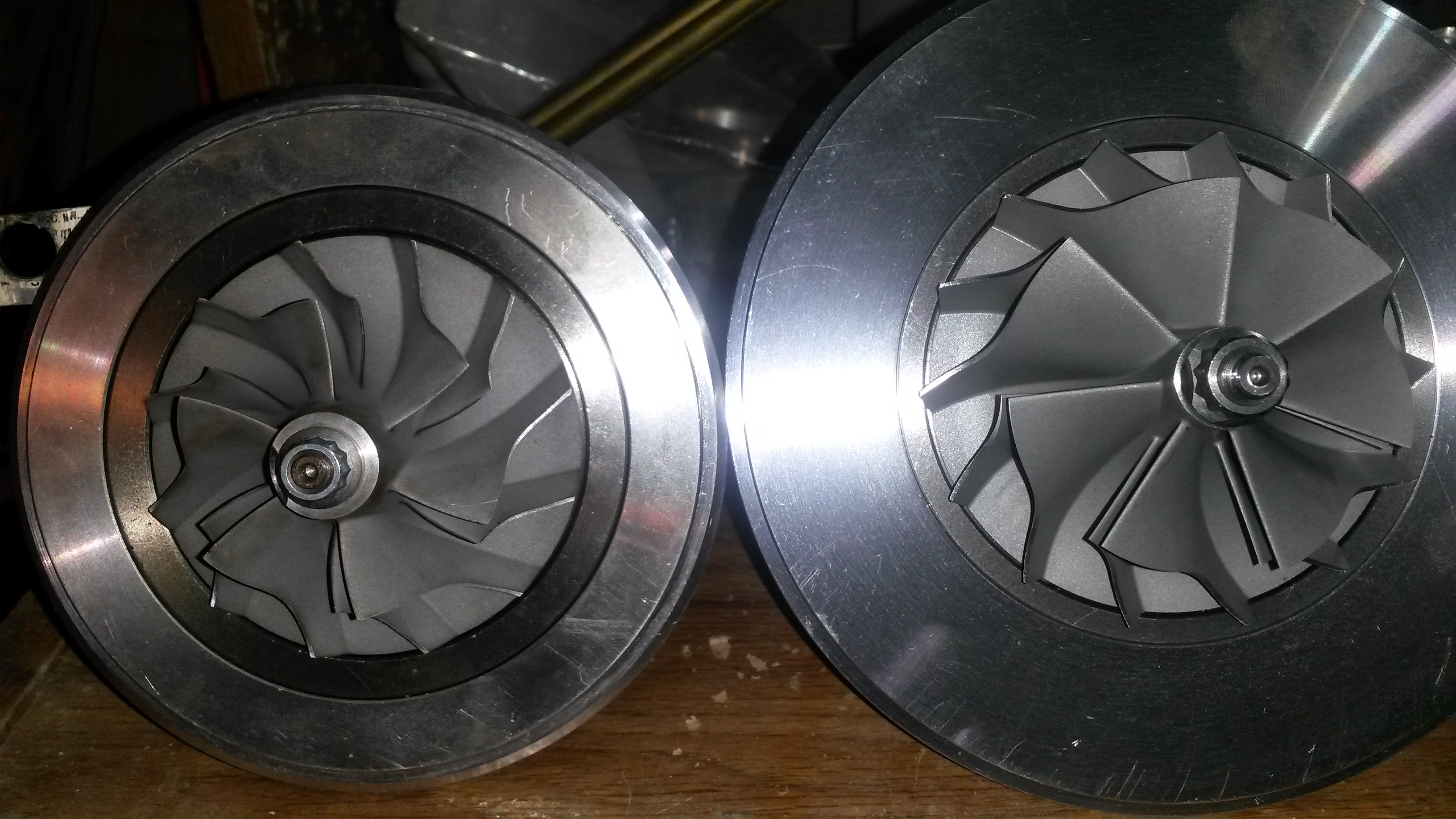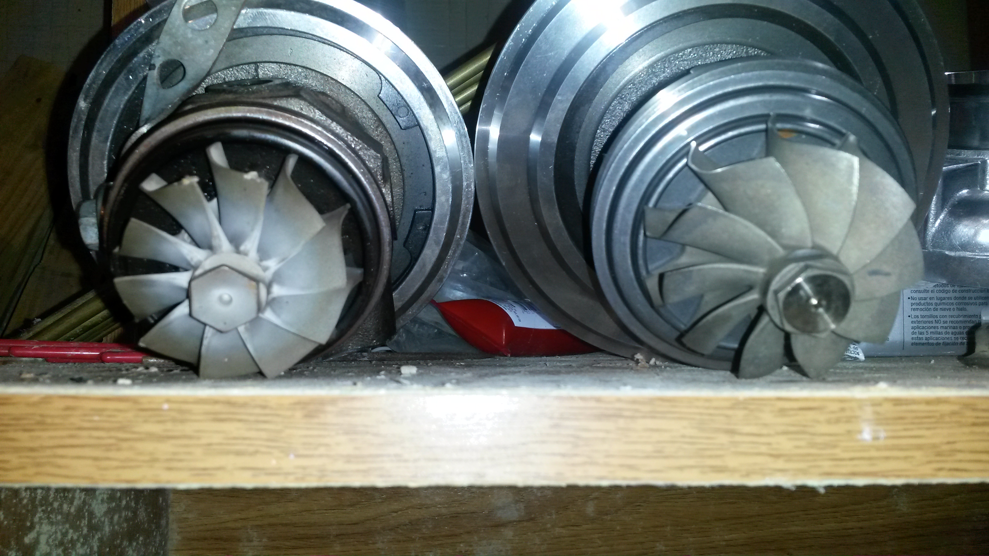 Got the new turbo apart, inspected, and reassembled. It looks pretty nice. The compressor wheel on this new turbo is a lot bigger than the old one. The old one, the center diameter was really big and blocked a lot of airflow. The new one, that part is much smaller. The turbine blades on the old turbo were thicker and blocked more air as well, blades were really thick as they get close to the center. New one looks like it will flow much better. That, and new one is much bigger.