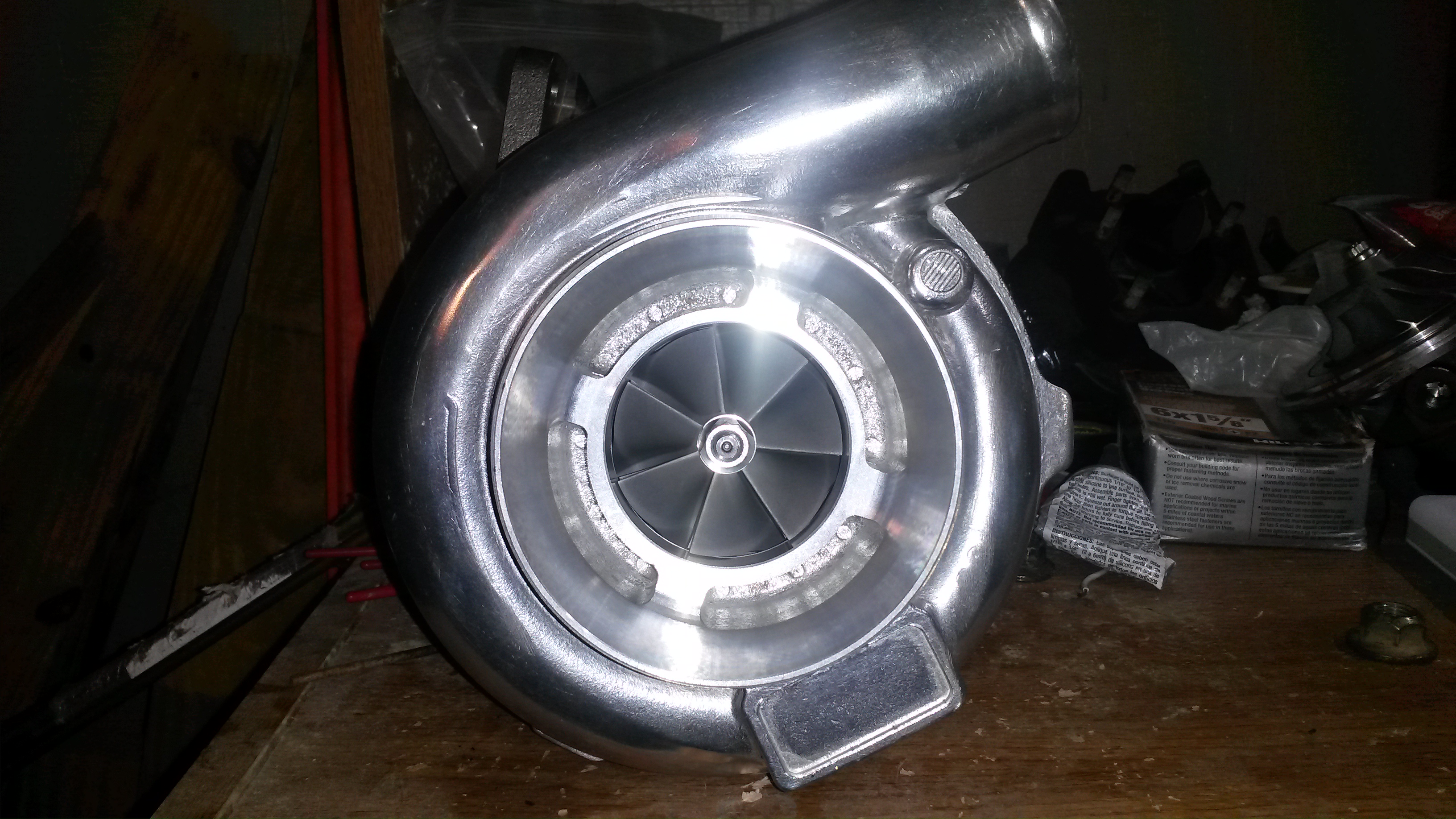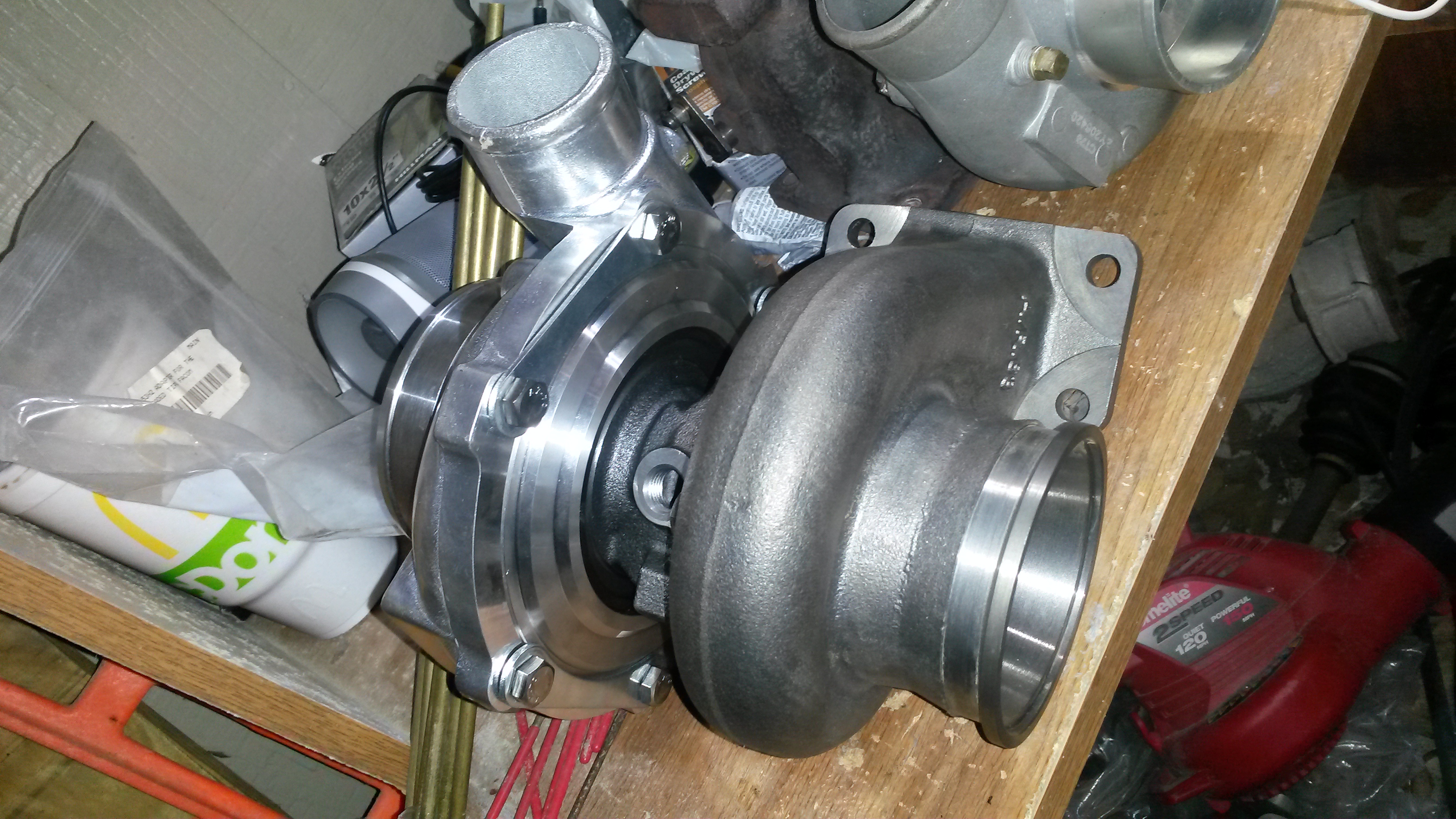 I'm betting it will flow 40-50% more air than the old turbo, should make for a nice upgrade. I'm going to hook up water lines to this one and water cool it. The last one I didn't hook them up (journal bearing ebay turbo) but I'm going to do it this time, it can only help.